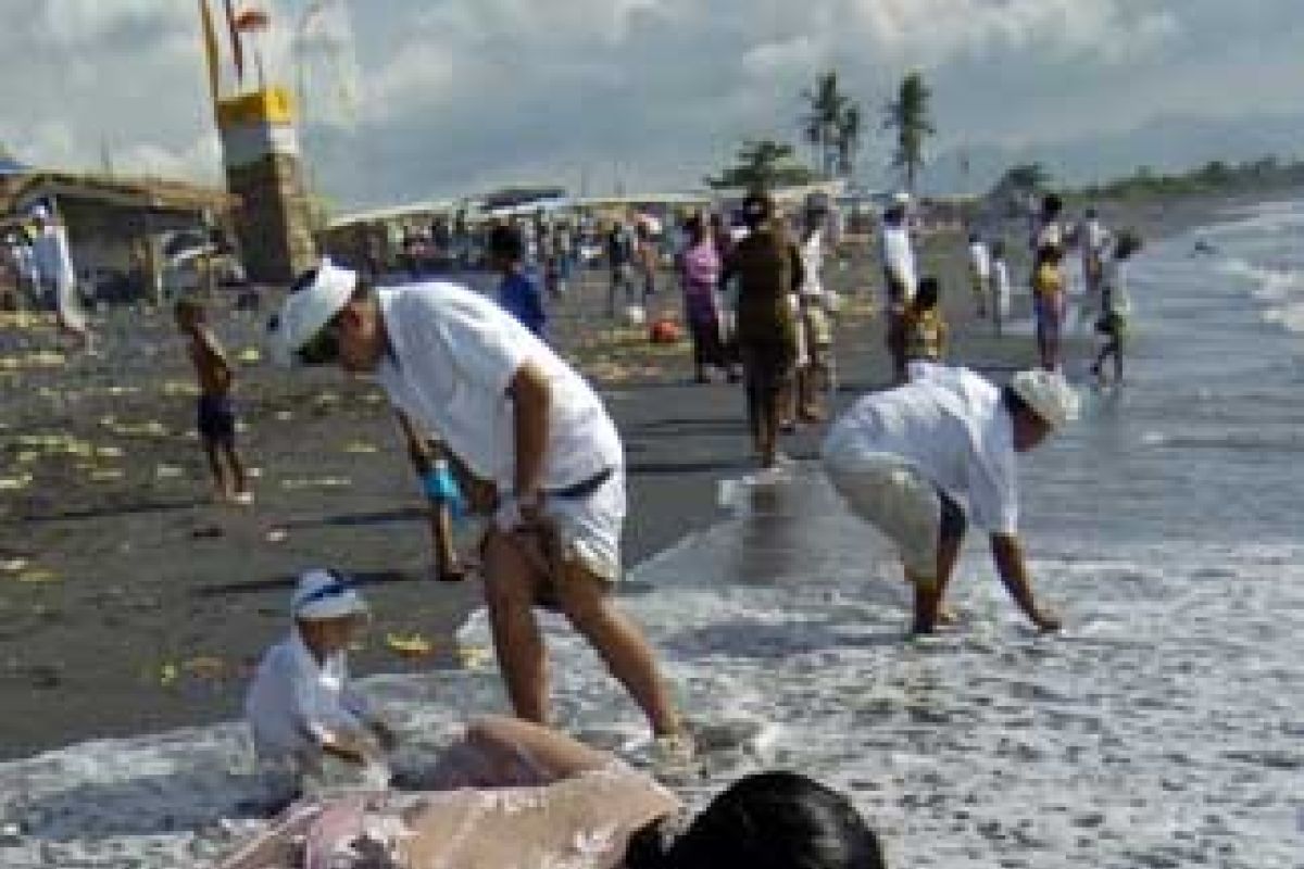 Gianyar (Antara Bali) - Beberapa Umat Hindu mengambil air laut yang diyakini dapat melebur wabah/hama terutama di lahan pertanian saat upacara "Nangluk Merana" di Pantai Lebih, Gianyar, Bali, Rabu (16/12). Ribuan Umat Hindu sejak pagi bergantian melakukan persembahyangan di tepi pantai untuk memohon kesucian dan hilangnya hama penyakit. FOTO ANTARA/Nyoman Budhiana/09.