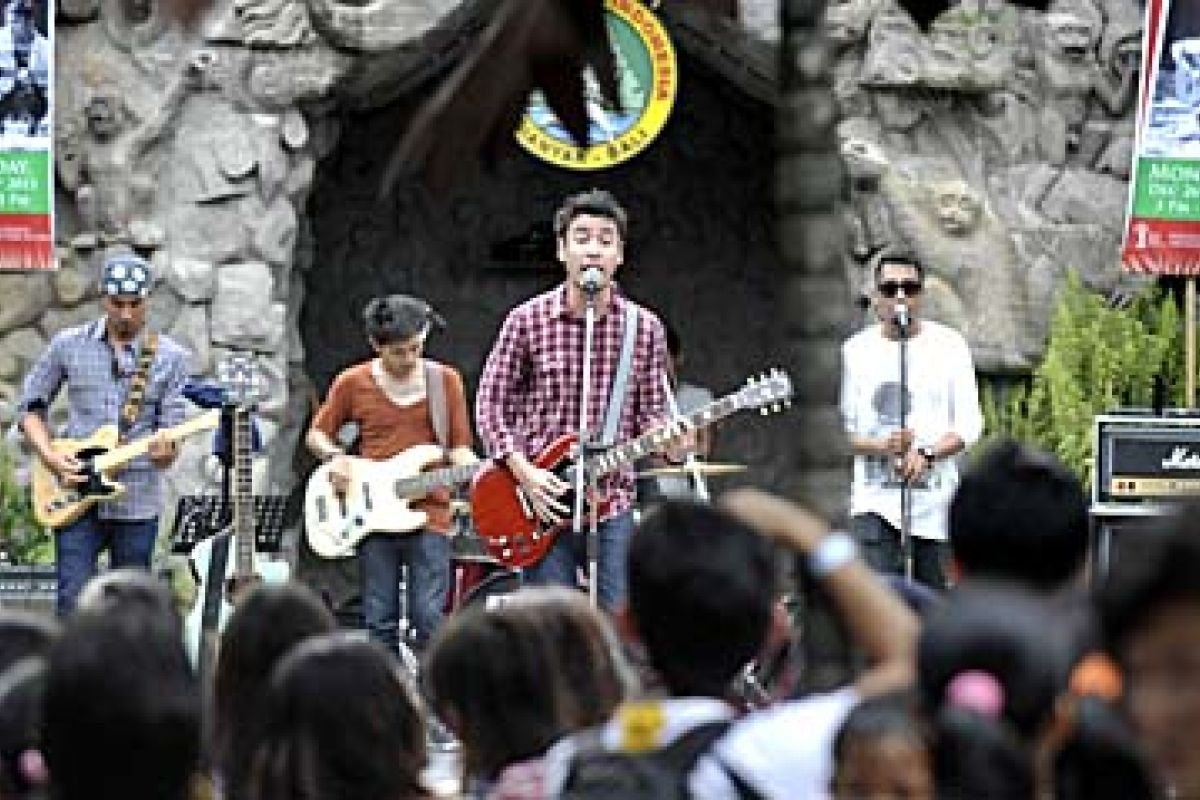 Gianyar (Antara Bali) - Penyanyi Marcello Tahitoe atau lebih dikenal dengan nama Ello (tengah) membawakan lagu-lagu populernya saat konser amal rangkaian perayaan Natal di Bali Safari dan Marine Park, Gianyar, Bali, Senin (26/12). Kegiatan amal yang bertajuk "Christmas Charity Concert With Ello" itu untuk mengumpulkan dana bagi anak yatim piatu. FOTO ANTARA/Nyoman Budhiana/11.