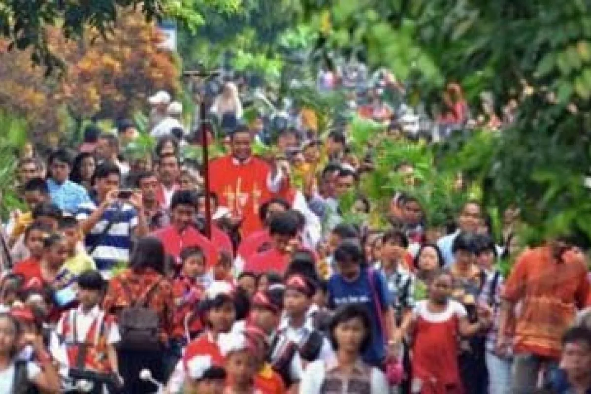 2Semarang (Antara Bali) - Ratusan umat Katolik saat mengikuti perarakan perayaan Ekaristi Minggu Palma menuju Gereja St Teresia di Semarang, Jateng, Minggu (24/3). Minggu Palma menjadi tanda dimulainya pekan suci bagi umat Katolik. FOTO ANTARA/R. Rekotomo/nym/2013.