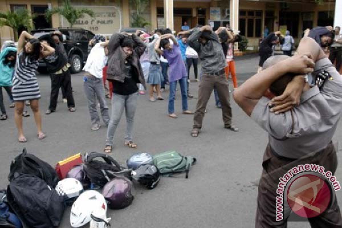 1Jember (Antara Bali) - Polisi memimpin senam sejumlah pasangan yang diduga melakukan mesum, di Mapolres Jember, Jawa Timur, Jumat (19/4). Dalam dua hari terahir, 47 pasangan mesum terjaring razia dari sejumlah hotel di Jember. FOTO ANTARA/Seno S./nym/2013.