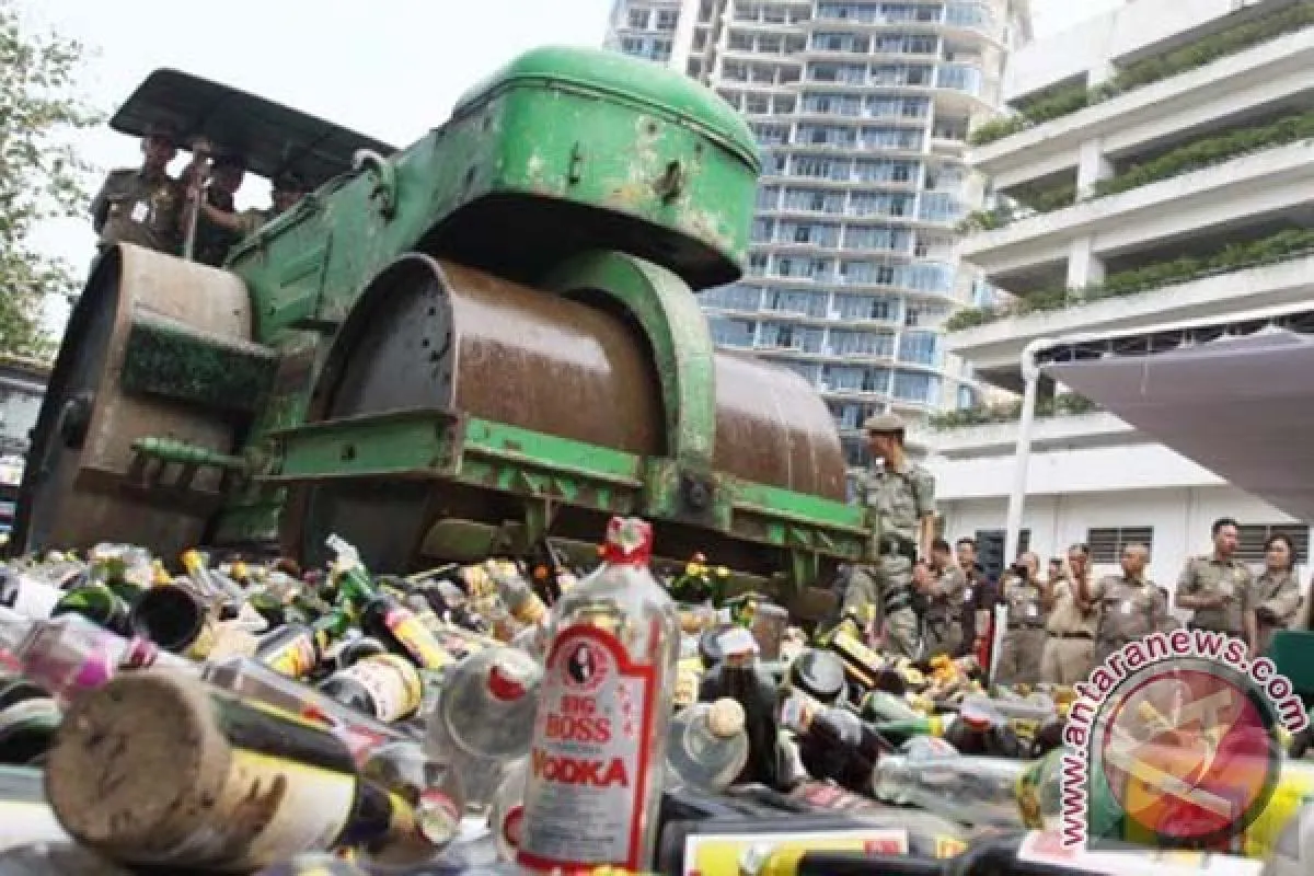 1Alat berat digunakan untuk menghancurkan ribuan botol minuman keras (miras) pada pemusnahan di Halaman Kantor Walikota Jakarta Barat, Rabu (24/7). Sebanyak 2.250 botol miras berbagai jenis hasil razia pada bulan April-Juli itu dimusnahkan guna mencegah penyalahgunaan di Ramadhan. ANTARA FOTO/Dhoni Setiawan/nym/2013.