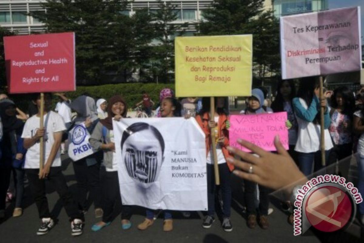 1Sejumlah pelajar dan aktivis yang tergabung dalam komite aksi perempuan menggelar aksi menolak tes keperawanan di Bundaran HI, Jakarta, Minggu (15/9). Mereka mendesak Kementerian Pendidikan Nasional dan Kementerian Kesehatan bertindak tegas melakukan pelarangan tes keperawanan di semua tingkat instansi pendidikan karena hanya akan menjadikan perempuan sebagai objek seksual. ANTARA FOTO/Zabur Karuru/nym/2013.