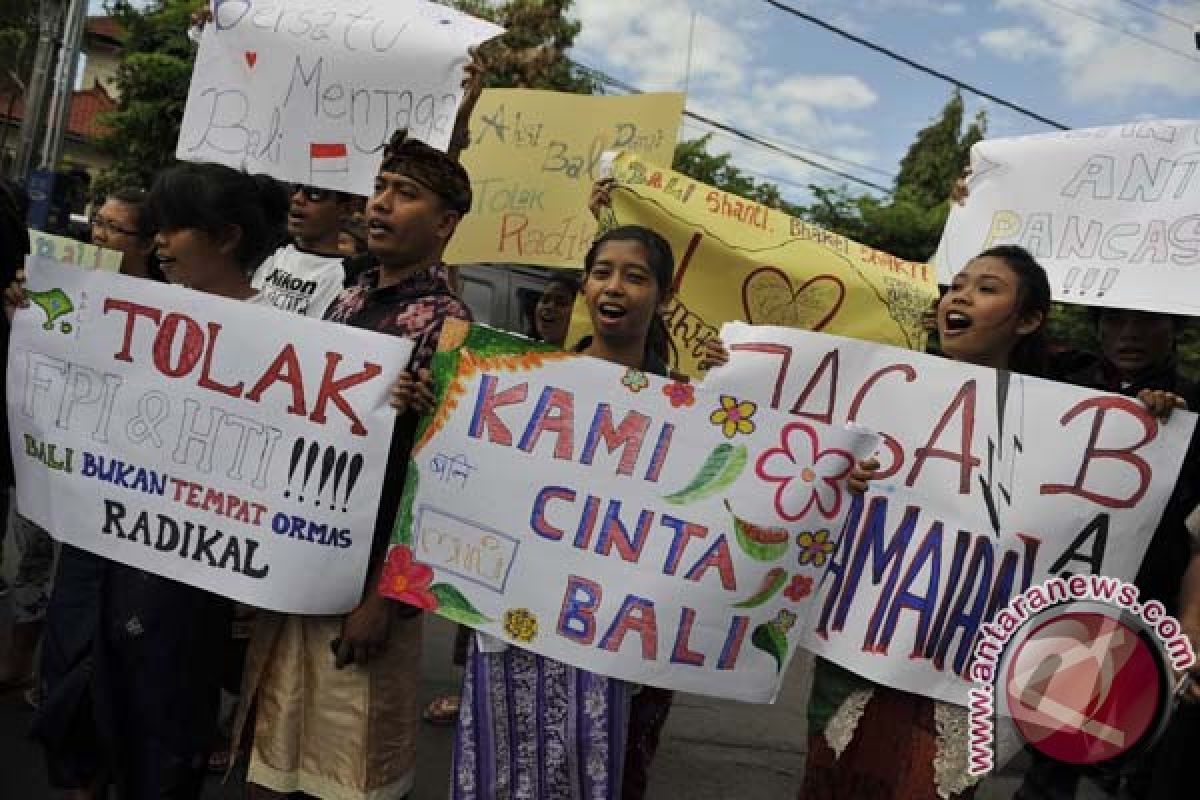 1Sejumlah pengunjuk rasa memajang tulisan dalam aksi anti radikalisme di depan Markas Polda Bali, Denpasar, Senin (16/9). Pengunjuk rasa dari berbagai elemen yang tergabung dalam Aliansi Pemuda Bali Dvipa itu menuntut Polisi agar bertindak tegas terhadap ormas radikal yang akhir-akhir ini berusaha merusak kedamaian dan mengadu domba umat beragama di Bali. ANTARA FOTO/Nyoman Budhiana/nym/2013.