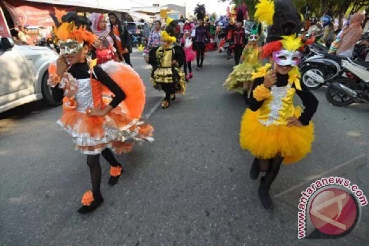 1Sejumlah anak mengenakan pakaian kreasi budaya lokal pada karnaval seni dan budaya dalam Festival Teluk Palu (FTP) ke-4 di Pantai Talise, Palu, Sulawesi Tengah, Jum'at (27/9). Festival yang digelar 27-29 September 2013 itu menampilkan berbagai aneka seni dan budaya setempat untuk mengenalkan dan menjadikan Kota Palu sebagai salah satu tujuan wisata di Indonesia. ANTARA FOTO/Mohamad Hamzah/nym/2013.