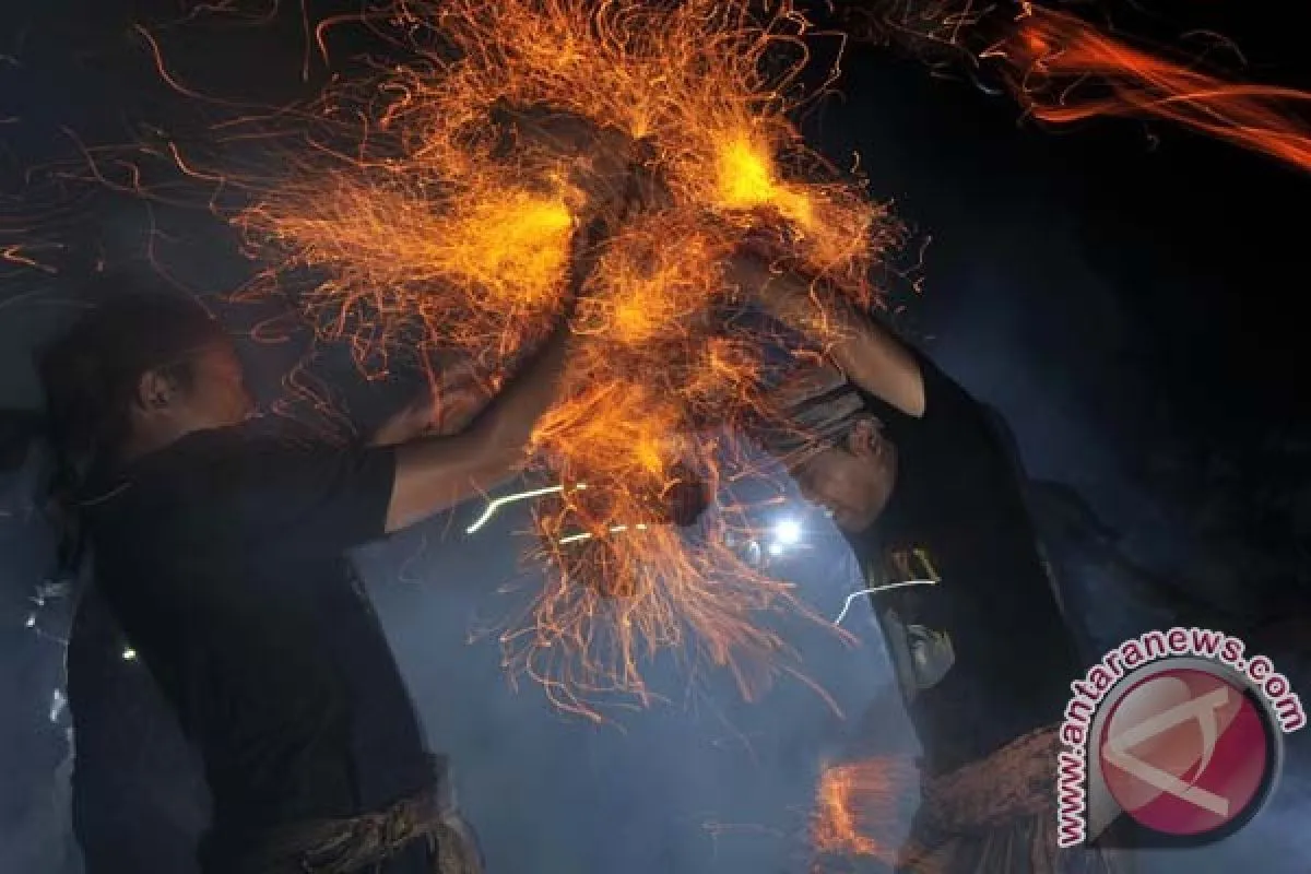 1Dua pemuda saling memukulkan api dari sabut kelapa dalam tradisi Mesiat Geni atau perang api di Desa Tuban, Badung, Bali, Sabtu (19/10). Tradisi tahunan tersebut merupakan rangkaian persembahyangan Purnama Kapat (bulan purnama di bulan ke-4 perhitungan Bali) untuk keharmonisan sekaligus memupuk persaudaraan. ANTARAFOTO/Nyoman Budhiana/nym/2013.