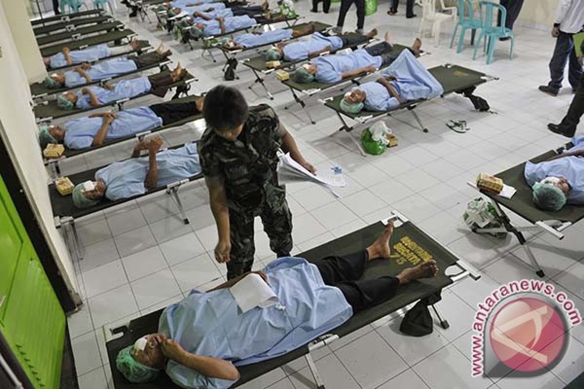1Prajurit TNI membantu pasien dalam operasi katarak di Rumah Sakit Angkatan Darat (RSAD), Denpasar, Bali, Sabtu (1/3). Operasi yang digelar Komando Resor Militer 163/Wirasatya tersebut merupakan kegiatan amal TNI untuk membantu pemberantasan katarak di Bali. FOTO ANTARA/Nyoman Budhiana/nym/2014.