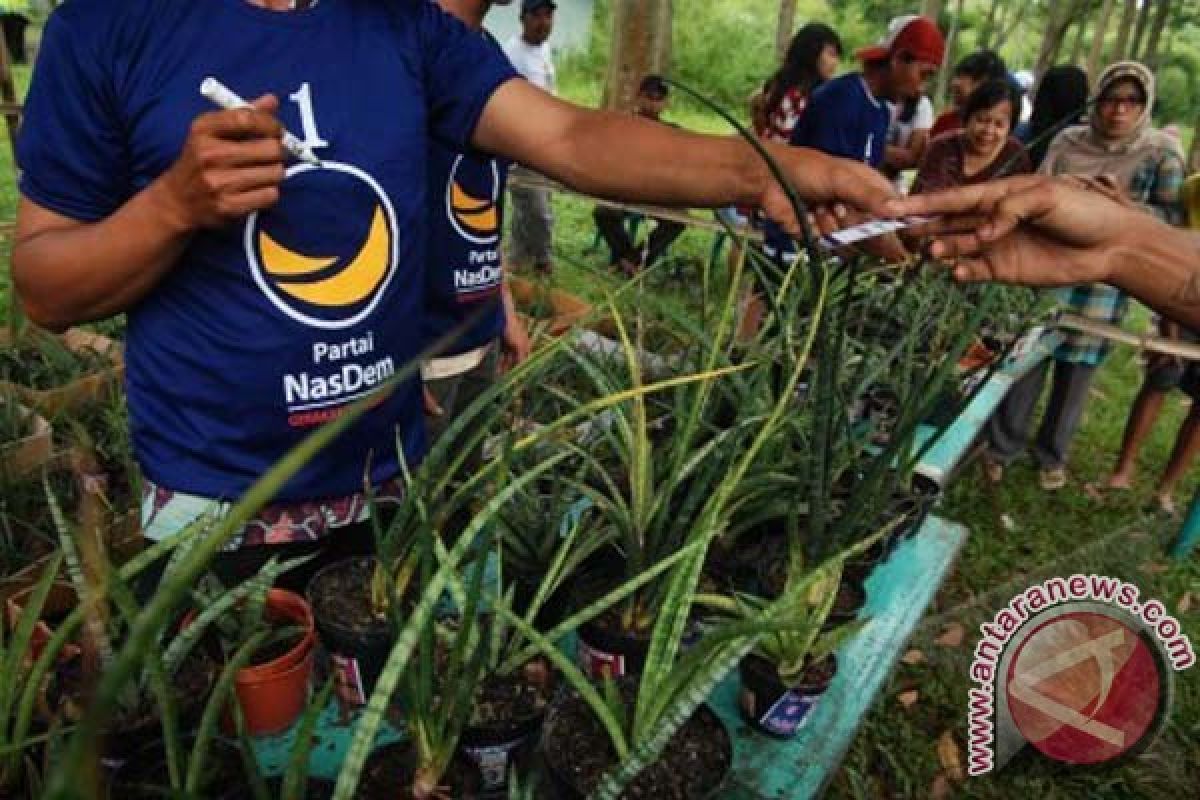 1Kader partai NasDem memberikan tanaman sansivieria atau lidah mertua yang berfungsi sebagai anti polutan kepada masyarakat saat kampanye Calon Legislatif DPRD Pati no 3 Dapil II dari Partai NasDem, Ayu Kusumaning di Pati, Jateng, Sabtu (22/3). Berbagai cara unik dan kreatif dilakukan oleh para caleg guna mendapatkan suara. ANTARA FOTO/ Andreas Fitri Atmoko/wdy/14