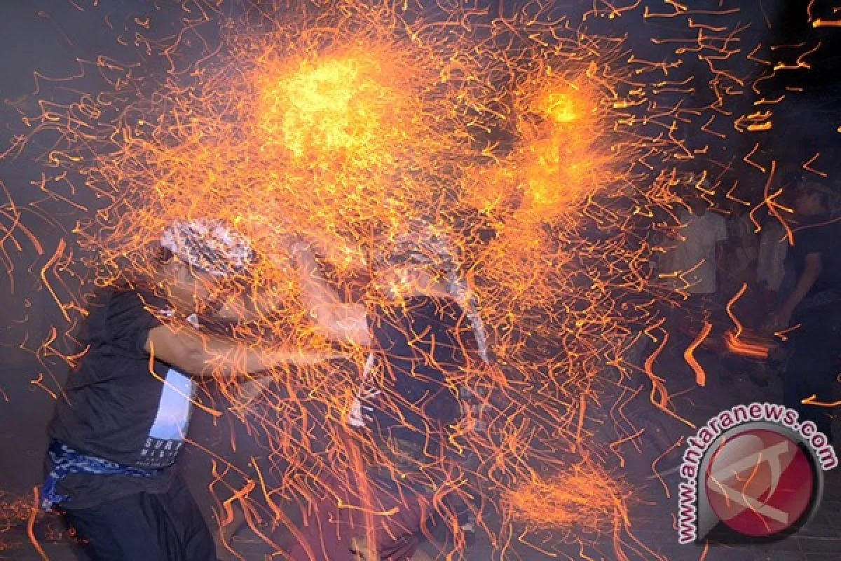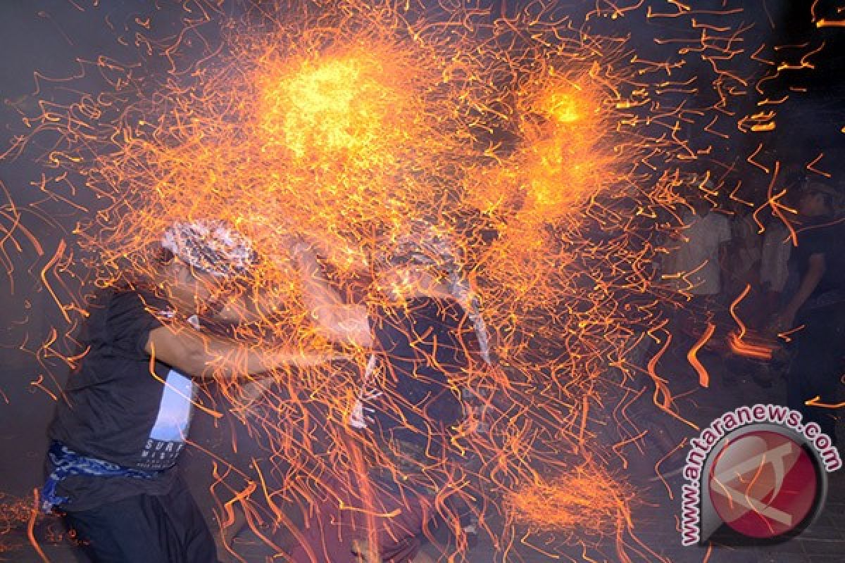 1Dua pemuda saling serang dengan api dari sabut kelapa dalam tradisi Mesiat Geni atau perang api di Desa Tuban, Kabupaten Badung, Bali, Rabu(8/10) malam. Tradisi tahunan tersebut merupakan rangkaian persembahyangan di bulan purnama untuk keharmonisan sekaligus memupuk persaudaraan. ANTARA FOTO/Wira Suryantala/i018/14.
