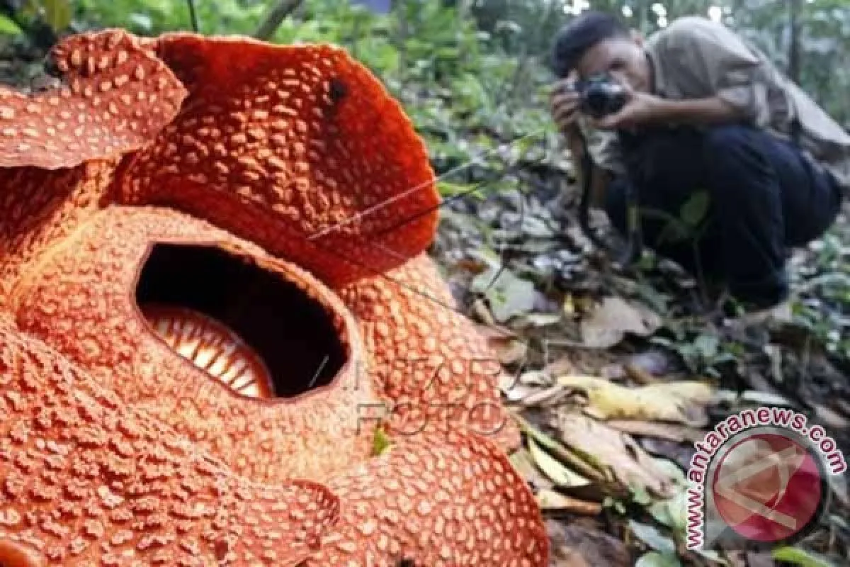 1Seorang pria memotret sebuah Bunga Raflesia (Raflesia arnoldii) di kawasan Rhino Camp, Kecamatan Belimbing Bengkunat, Pesisir Barat, Lampung, Jumat (5/12). Bunga Raflesia merupakan salah satu jenis tumbuhan langka yang bisa ditemui di lokasi tersebut. ANTARA FOTO/Regina Safri/wdy/14.