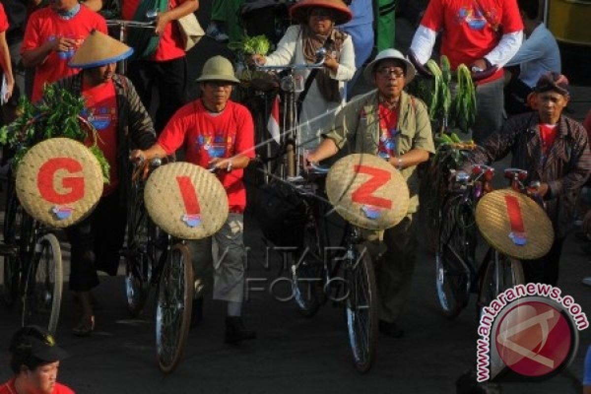 1Sejumlah warga dari berbagai komunitas mengikuti karnaval Ayo Melek Gizi saat memperingati Hari Gizi Nasional di ruas Jalan MH Thamrin, Jakarta, Minggu (25/1). Kegiatan tersebut dalam rangka mendukung peningkatan kesadaran dan kepedulian masyarakat akan gizi seimbang dan pola makan sehat. ANTARA FOTO/Zabur Karuru/wdy/15