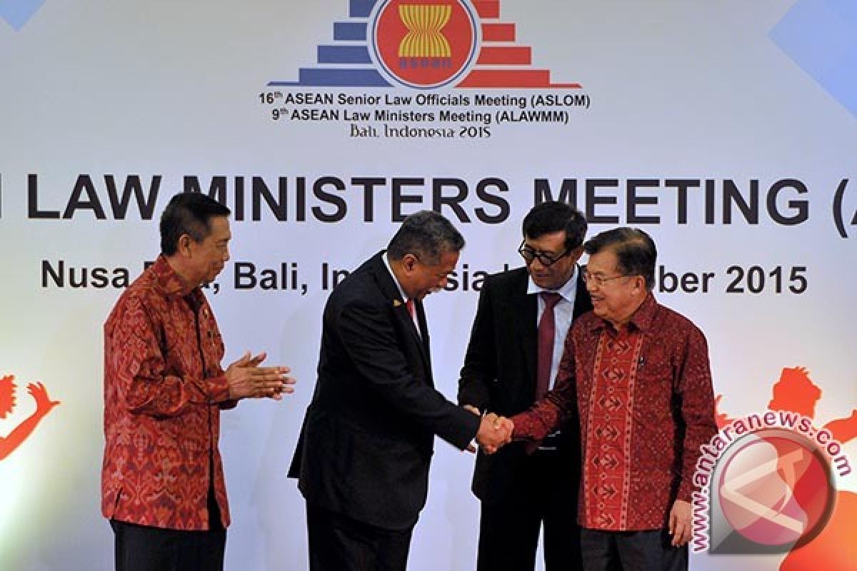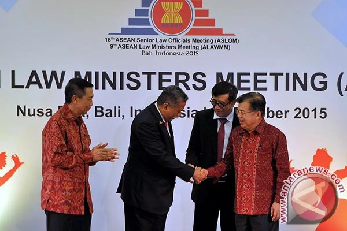 1Wakil Presiden, Jusuf Kalla (kanan) berjabat tangan dengan Deputy Sekjen ASEAN, Ahmad Kurnia Prawira Mochtan yang diampingi Menteri Hukum dan HAM Yasonna H. Laoly (kedua kanan) dan Gubernur Bali Made Mangku Pastika (kiri) saat pembukaan Pertemuan ke-9 Menteri-Menteri Bidang Hukum ASEAN (ALAWMM) di Nusa Dua, Bali, Kamis (22/10). Konferensi selama lima hari tersebut untuk membahas konvensi internasional yang akan disepakati bersama menjelang pemberlakuan masyarakat ekonomi ASEAN 2015. ANTARA FOTO/Nyoman Budhiana/i018/2015.