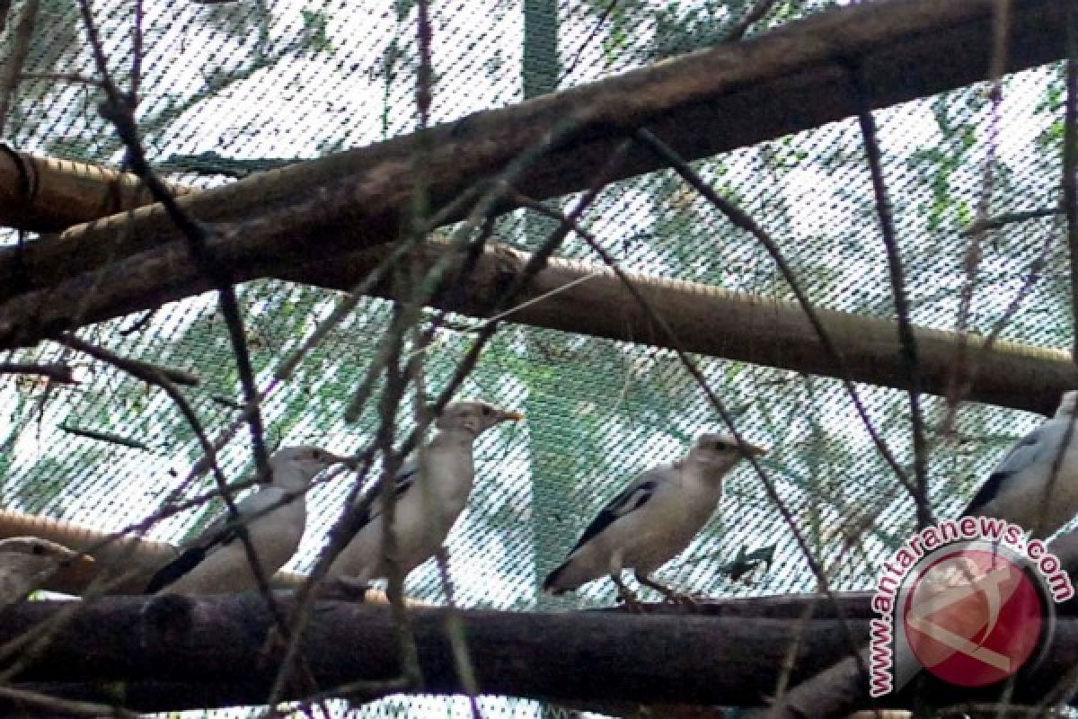 1Sejumlah burung Jalak Putih (Sturnus melanopterus) bertengger di kandangnya saat program pelepasliaran di Taman Safari Indonesia (TSI), Cisarua, Kabupaten Bogor, Jawa Barat, Sabtu (11/6). Dalam rangkaian Pekan Lingkungan Hidup Internasional, TSI melepasliarkan 40 burung Jalak Putih ke alam bebas sebagai upaya untuk mengembalikan serta meningkatkan populasi burung endemik Indonesia tersebut karena keberadaannya semakin terancam oleh hilangnya habitat serta maraknya perburuan liar. ANTARA FOTO/Arif Firmansyah/wdy/16.