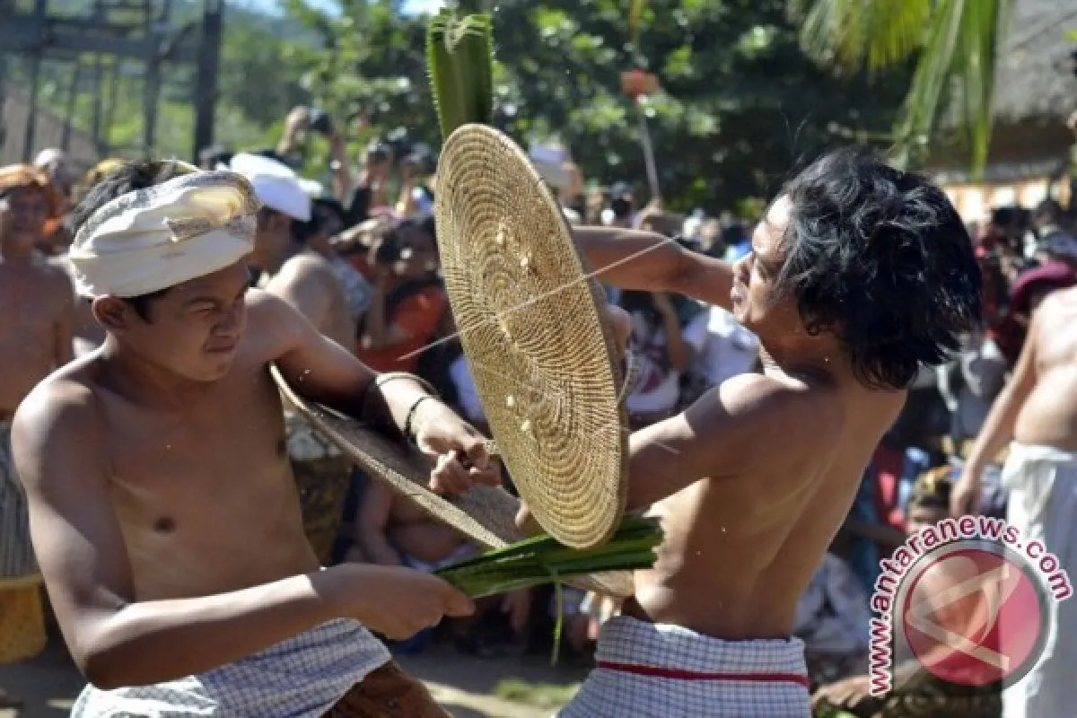 1Dua warga saling menyerang dengan daun pandan berduri dalam tradisi Mekare atau perang pandan di Desa Tenganan Pegringsingan, Karangasem, Bali, Jumat (24/6). Tradisi setahun sekali tersebut merupakan rangkaian persembahyangan warga setempat sebagai bentuk penghormatan terhadap Dewa Indra atau Dewa Perang sekaligus sebagai Dewa Kemakmuran. ANTARA FOTO/Wira Suryantala/wdy/16.
