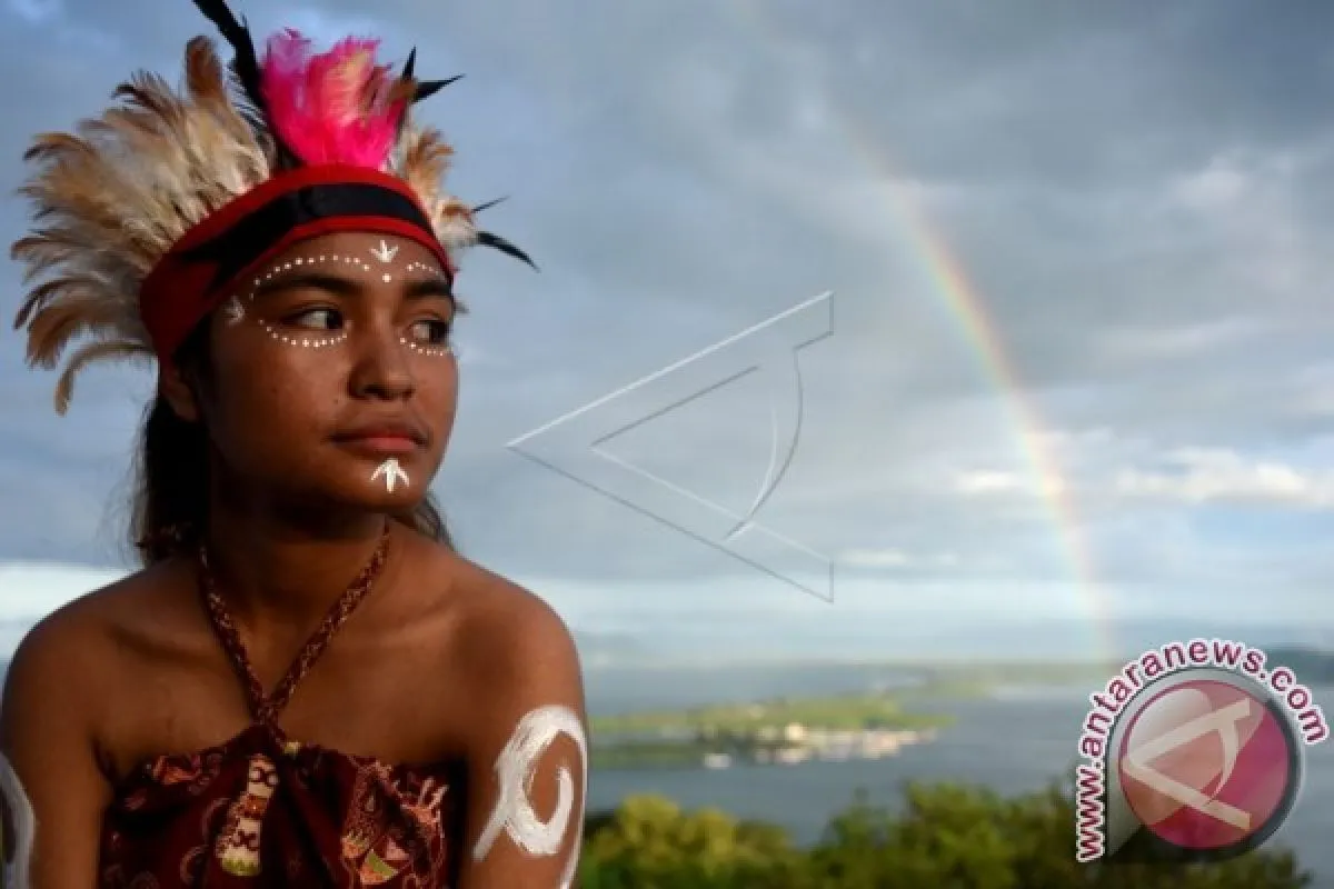 Seorang penari berpose saat di sela-sela pentas seni Skyline To di Bukit Jokowi Skyline, Kota Jayapura, Papua, Sabtu (11/3). Pentas paduan seni yang digagas Komunitas Action Papua ini bertujuan untuk memperkenalkan budaya Papua mulai dari alat musik, tarian, suara, dan sebagainya. Kegiatan ini dijadwalkan diselenggarakan setiap bulan. ANTARA FOTO/Indrayadi TH/wdy/17.
