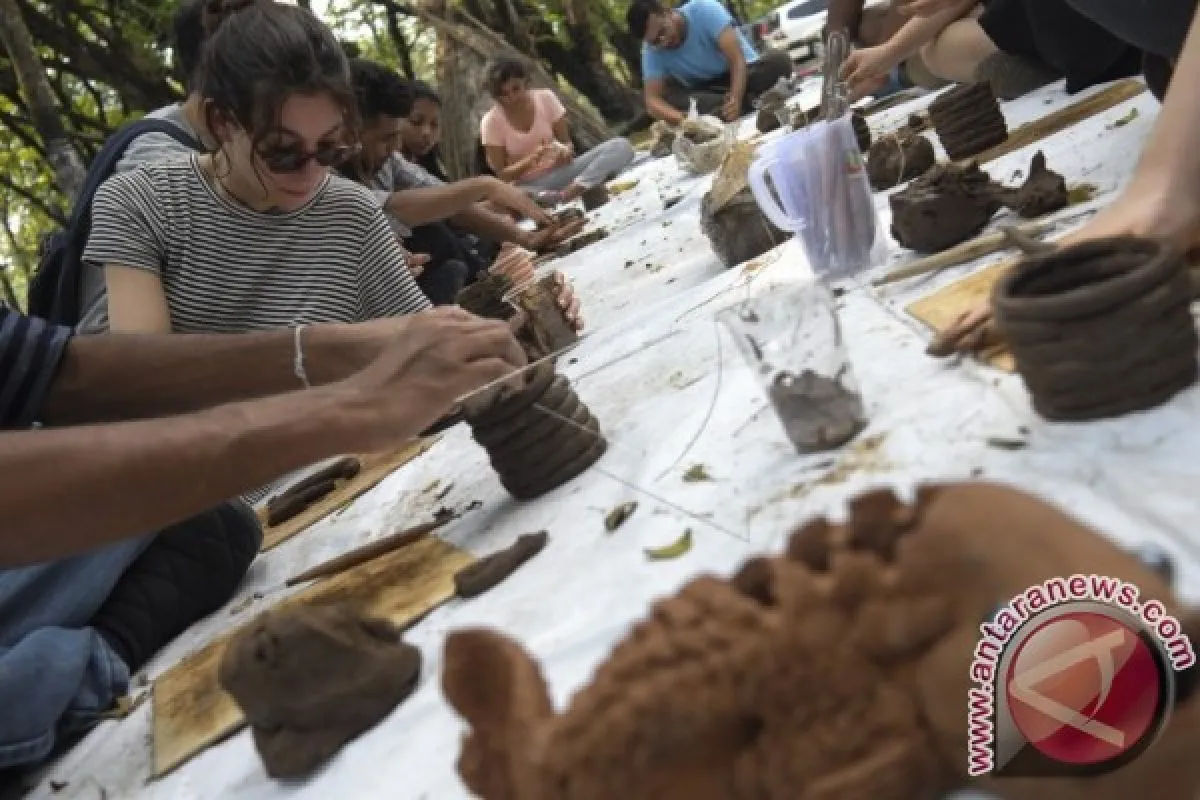 1Sejumlah mahasiswa asing membuat gerabah saat pelatihan singkat di Galeri Fakultas Seni Rupa dan Desain UNS, Solo, Jawa Tengah, Rabu (14/6). Selain praktik membuat gerabah, pelatihan yang diikuti 28 mahasiswa asing dari berbagai negara itu juga diisi dengan praktik membuat batik serta mengunjungi tempat-tempat pariwisata di Indonesia. ANTARA FOTO/Maulana Surya/wdy/17.
