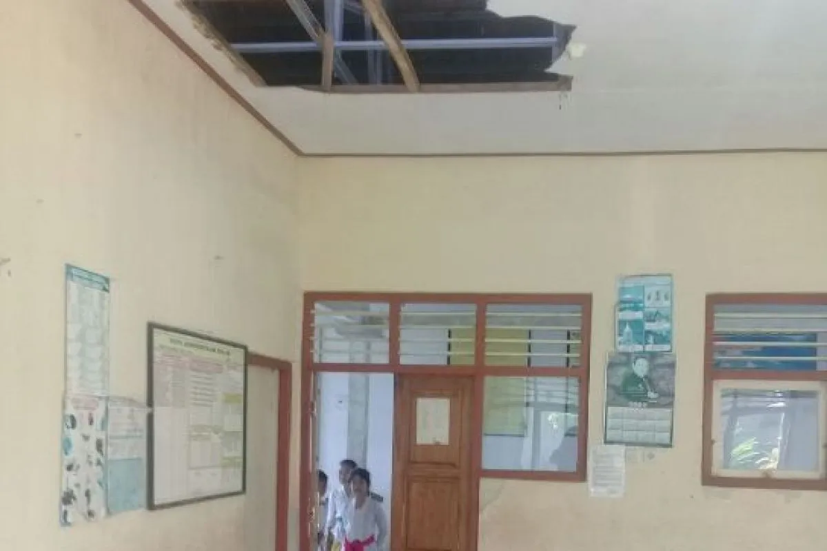 Pantauan di lokasi, plafon ruang kelas tampak berlubang besar karena tertimpa genteng yang rontok hingga ke lantai kelas.