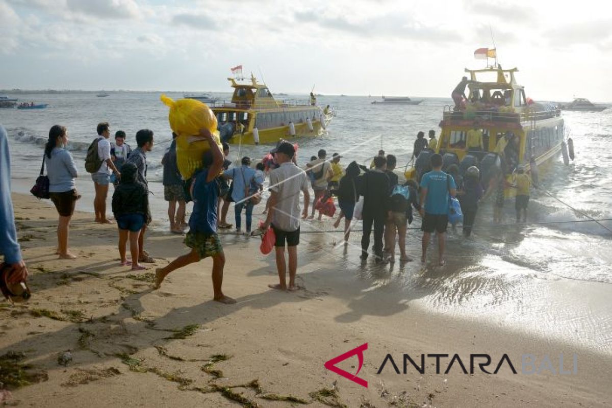 Sejumlah pemudik bersiap naik kapal cepat menuju Nusa Penida melalui penyeberangan di Pantai Sanur, Denpasar, Bali, Senin (28/5). Sebagian besar umat Hindu mulai mudik ke kampung halaman mereka untuk merayakan Hari Raya Galungan yang jatuh pada Rabu (30/5) mendatang. ANTARA FOTO/Wira Suryantala/wdy/2018.