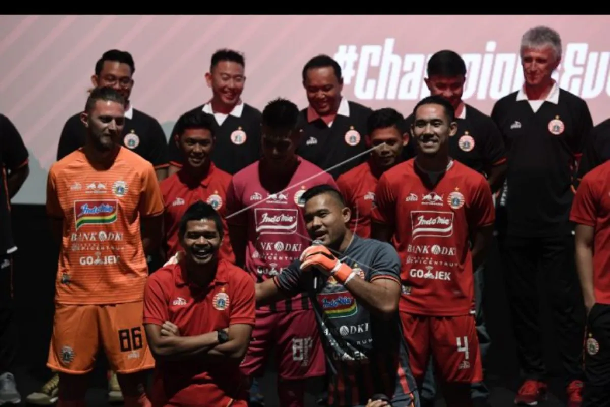 Kapten Persija Andritany Ardhiyasa (kanan depan) bersama pemain senior Persija Bambang Pamungkas (kiri depan) saat peluncuran tim dan jersey musim 2019-2020 di Jakarta, Jumat (17/5/2019). ANTARA FOTO/Puspa Perwitasari/nym.