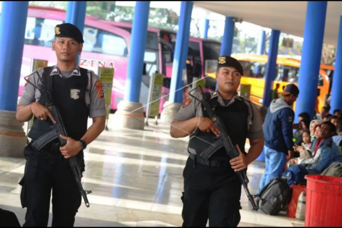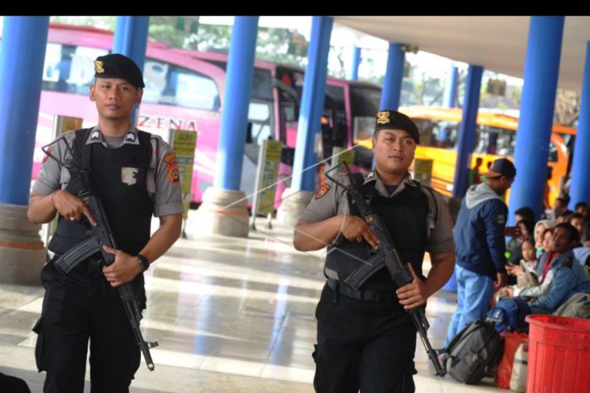 Petugas kepolisian bersenjata berpatroli di Terminal Tipe A Mengwi, Badung, Bali, Rabu (29/5/2019). Pengamanan di terminal bus tersebut dilakukan untuk menekan angka kriminalitas dan memberi rasa aman bagi para pemudik selama arus mudik lebaran 2019. ANTARA FOTO/Fikri Yusuf/nym.