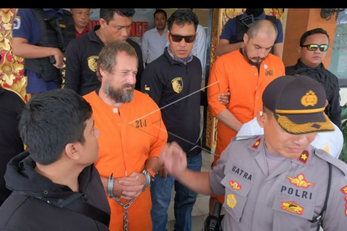 Polisi menggiring dua warga negara Rusia Robert Haupt (kedua kanan) dan Georgii Zhukov (kedua kiri) yang terlibat kasus perampokan money changer saat pelimpahan kasus tersebut untuk proses persidangan, di Mapolresta Denpasar, Bali, Senin (17/6/2019). Kasus perampokan money changer di Benoa, Kuta Selatan pada bulan Maret 2019 itu melibatkan empat warga negara Rusia yaitu dua orang menjalani proses hukum, seorang tewas tertembak dan seorang lagi masih buron. ANTARA FOTO/Nyoman Hendra Wibowo/nym.
