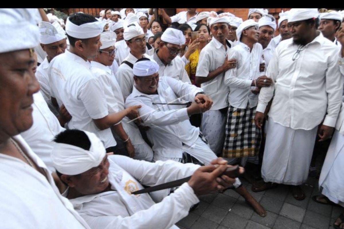 Umat Hindu yang kesurupan menusukkan keris ke tubuhnya saat Tradisi Ngerebong di Pura Dalem Pengrebongan, Denpasar, Bali, Minggu (11/8/2019). Tradisi tersebut dilakukan bertujuan menyucikan alam dan menetralisir kekuatan negatif sekaligus untuk menciptakan keharmonisan. ANTARA FOTO/Fikri Yusuf/nym.