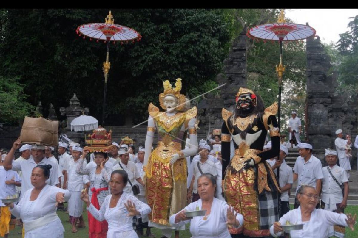 Umat Hindu membawa benda-benda sakral dalam tradisi Mapeed di Pura Alas Kedaton, Tabanan, Bali, Selasa (13/8/2019). Tradisi yang digelar setiap enam bulan sekali tersebut merupakan rangkaian upacara persembahyangan di pura yang terletak di dalam areal obyek wisata Alas Kedaton. ANTARA FOTO/Nyoman Hendra Wibowo/nym.
