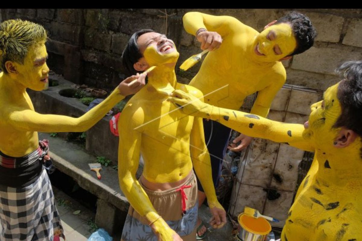 Sejumlah remaja mengecat tubuhnya menjelang berkeliling kampung dalam tradisi Ngerebeg di Desa Tegallalang, Gianyar, Bali, Rabu (28/8/2019). Tradisi ngerebeg tersebut merupakan rangkaian upacara persembahyangan di Pura Duur Bingin Desa Tegallalang yang digelar setiap enam bulan sekali untuk memohon keselamatan dan ritual tolak bala. ANTARA FOTO/Nyoman Hendra Wibowo/nym.