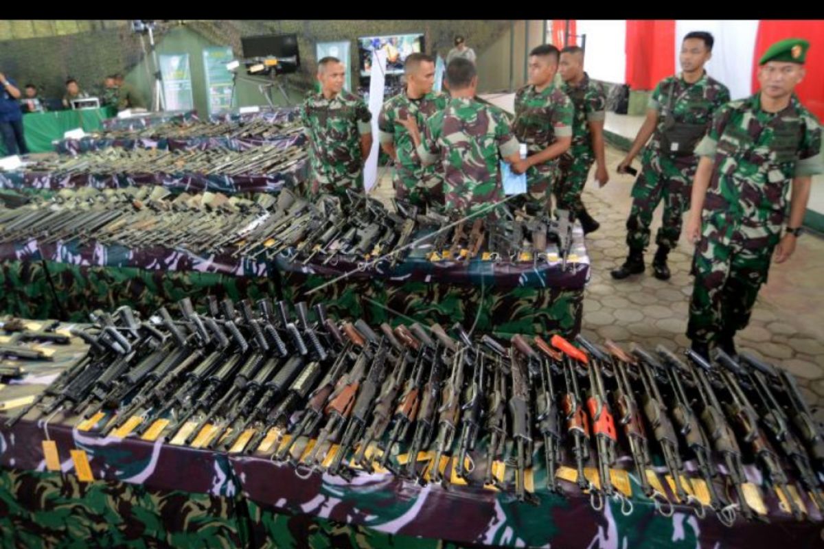Prajurit TNI Kodam Iskandar Muda berdiri di samping deretan berbagai jenis senjata api saat kunjungan Kepala Staf Angkatan Darat (Kasad) Jenderal TNI Andika Perkasa di Banda Aceh, Kamis (29/8/2019). Sebanyak 118 pucuk senjata api laras panjang dan laras pendek termasuk senjata rakitan sisa konflik Aceh tersebut diserahkan warga secara sukarela kepada TNI di Aceh. ANTARA FOTO/Ampelsa/nym.