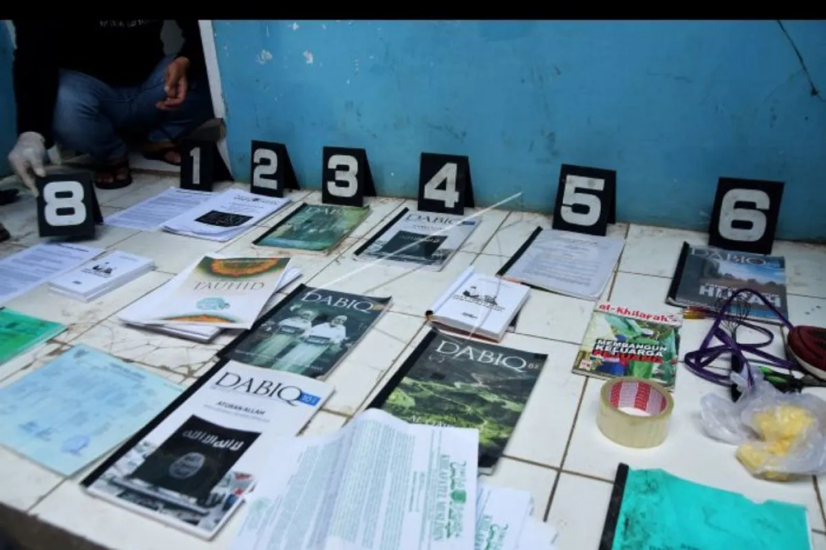 Sejumlah barang bukti diperluhatkan oleh polisi seusai menggeledah kontrakan terduga teroris berinisial NAS dari kelompok Abu Zee Al Baghdadi di Kampung Rawa Kalong, Desa Karang Satria, Tambun Utara, Kabupaten Bekasi, Jawa Barat, Minggu (13/10/2019). Dari hasil penggeledahan tersebut Tim Densus 88 Mabes Polri mengamankan sejumlah barang bukti berupa buku-buku bertema khilafah, paku, kabel dan gunting. ANTARA FOTO/Arisanto/nym.