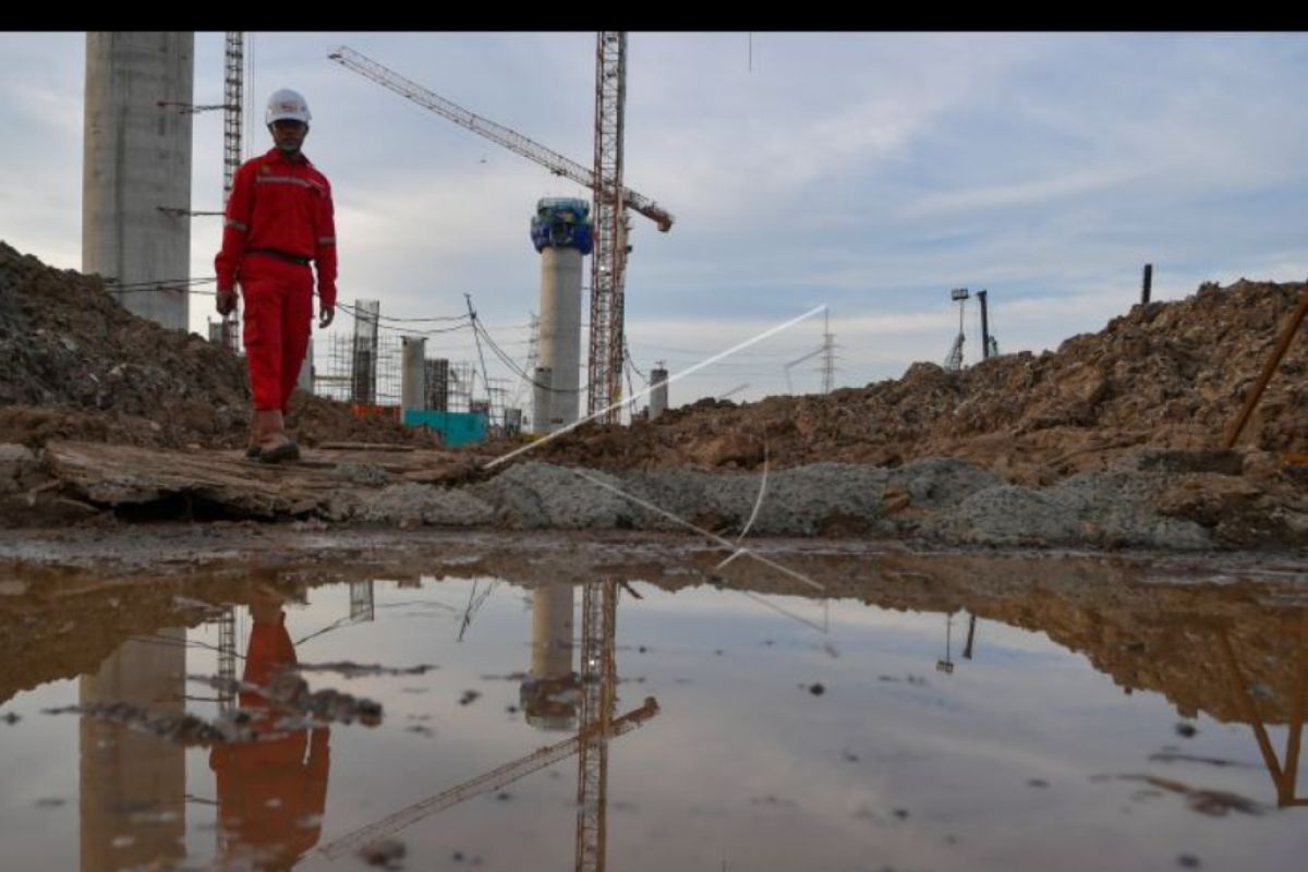 Pekerja melintas di proyek pembangunan 'Jakarta International Stadium' atau Stadion Bersih, Manusiawi dan Wibawa (BMW) di kawasan Papanggo, Tanjung Priok, Jakarta, Selasa (10/3/2020). Saat ini pembangunan proyek Stadion BMW yang akan memiliki kapasitas 80 ribu penonton tersebut telah mencapai tahap pekerjaan struktur bagian bawah dan struktur atas dengan persentase 19,6 persen. ANTARA FOTO/M Risyal Hidayat/nym.