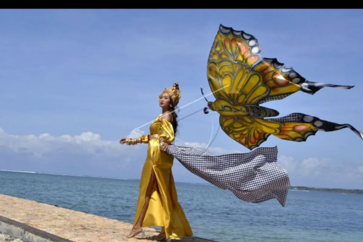 Model memperagakan busana bernuansa layang-layang disela-sela kegiatan Lomba Layangan Virtual di Sanur, Denpasar, Bali, Minggu (12/7/2020). Kegiatan yang diikuti 380 peserta dari berbagai daerah seperti Bali, NTB dan Sulawesi Utara tersebut dilakukan dengan proses penerbangan layangan yang dilakukan dari lingkungan tempat tinggal peserta dan ditampilkan serta dinilai melalui aplikasi 'Zoom' yang diselenggarakan untuk mewadahi pehobi layang-layang agar tetap dapat berkompetisi selama masa pandemi COVID-19. ANTARA FOTO/Fikri Yusuf/nym.