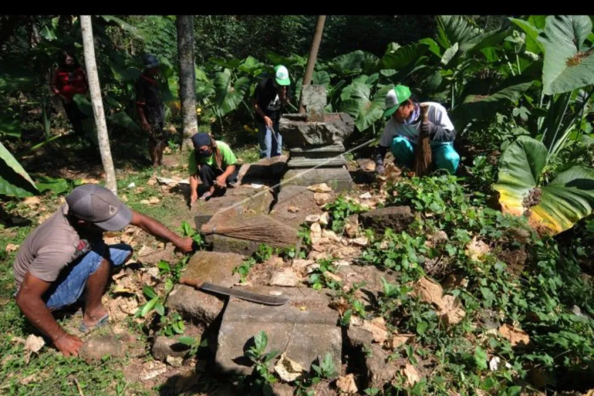 Sejumlah warga mencabuti rumput yang tumbuh diantara batu candi saat aksi membersihkan candi di Candi Tibayan, Jatinom, Klaten, Jawa Tengah, Minggu (23/8/2020). Aksi membersihkan candi era Mataram Kuno abad 9-10 yang dilakukan oleh Klaten Heritage Community (KHC) bersama warga setempat tersebut bertujuan untuk menjaga dan merawat benda cagar budaya yang memiliki nilai sejarah. ANTARA FOTO/Aloysius Jarot Nugroho