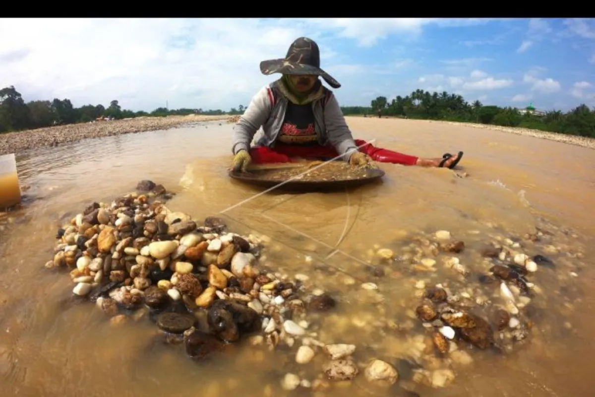 Warga mendulang bijih emas secara tradisional di pertemuan arus Sungai Batang Asai dan Sungai Batang Tembesi, Sarolangun, Jambi, Minggu (30/8/2020). Kegiatan yang biasa dilakukan warga setempat setiap memasuki musim air surut tersebut mampu menghasilkan pendapatan rata-rata Rp100 ribu sampai Rp150 ribu per hari. ANTARA FOTO/Wahdi Septiawan/nym.