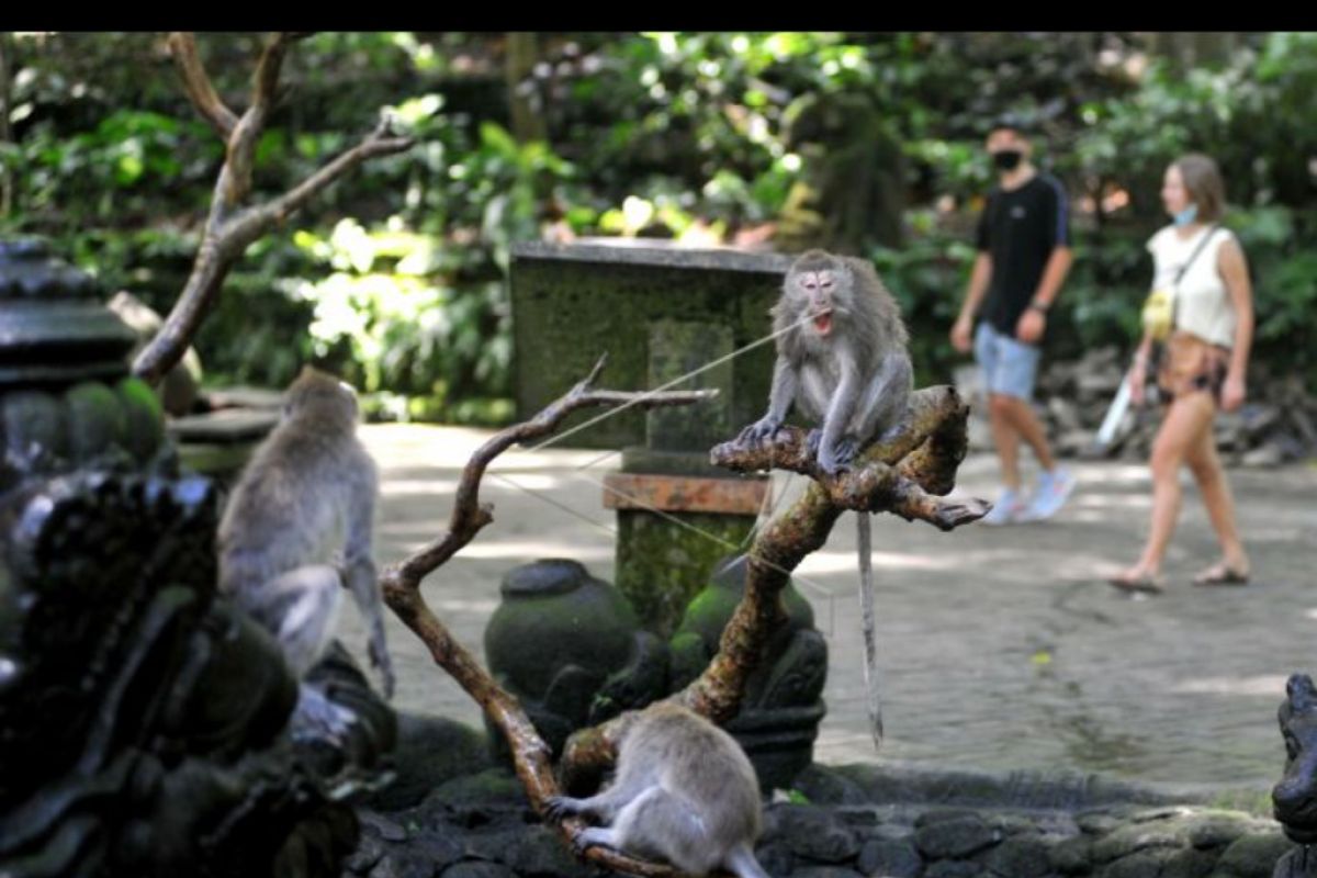 Wisatawan mengamati kera ekor panjang (Macaca fascicularis) saat mengunjungi Monkey Forest Ubud, Gianyar, Bali, Kamis (5/11/2020). Objek wisata unggulan di kawasan Ubud tersebut resmi dibuka kembali untuk kunjungan wisatawan setelah sempat ditutup sejak akhir bulan Maret lalu akibat pandemi COVID-19. ANTARA FOTO/Fikri Yusuf/nym.