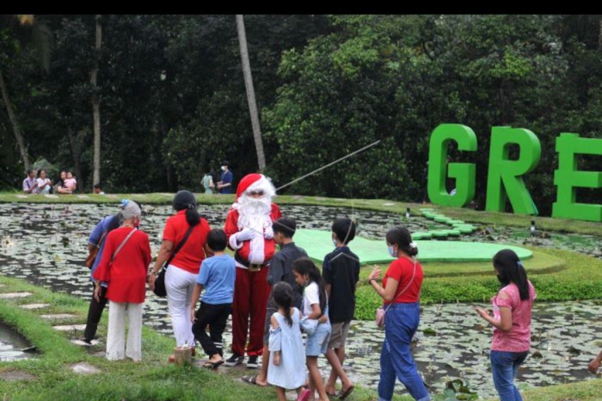 Petugas berkostum Sinterklas menghibur wisatawan di kawasan Tegallalang, Gianyar, Bali, Jumat (25/12/2020). Kegiatan tersebut dilakukan untuk memeriahkan Hari Raya Natal sekaligus menjadi daya tarik bagi pengunjung objek wisata tersebut. ANTARA FOTO/Fikri Yusuf/nym.