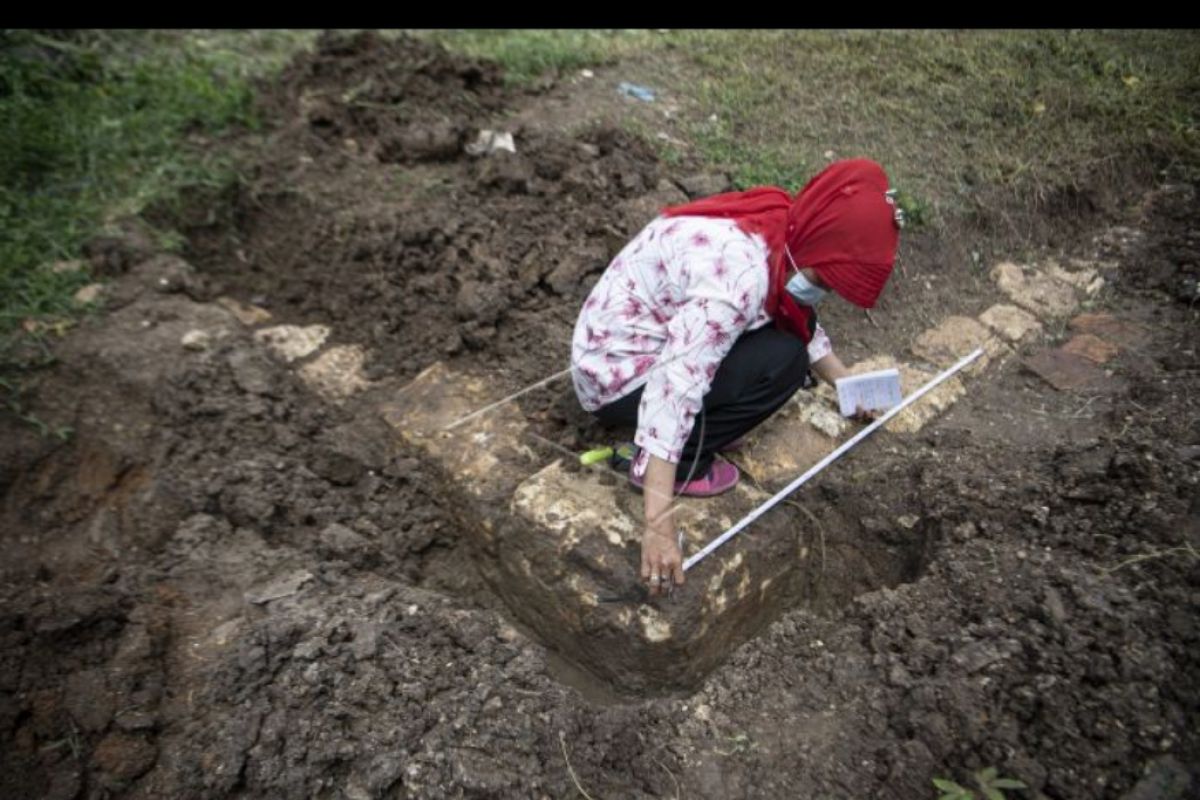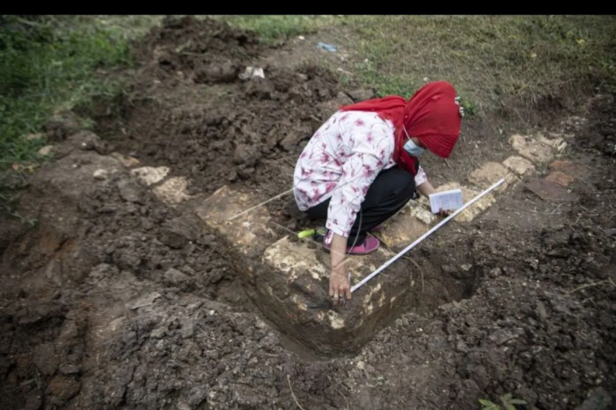 Arkeolog dari Balai Arkeologi Sumatera Selatan mengukur batu kapur yang ditemukan di kawasan Ilir Timur (IT) II, Palembang, Sumatera Selatan, Rabu (30/12/2020). Jejeran batu kapur tersebut diduga bangunan candi dari abad XII atau tepatnya di masa kekosongan pemerintahan antara kerajaan Sriwijaya dengan Kerajaan Palembang. ANTARA FOTO/Nova Wahyudi/nym.