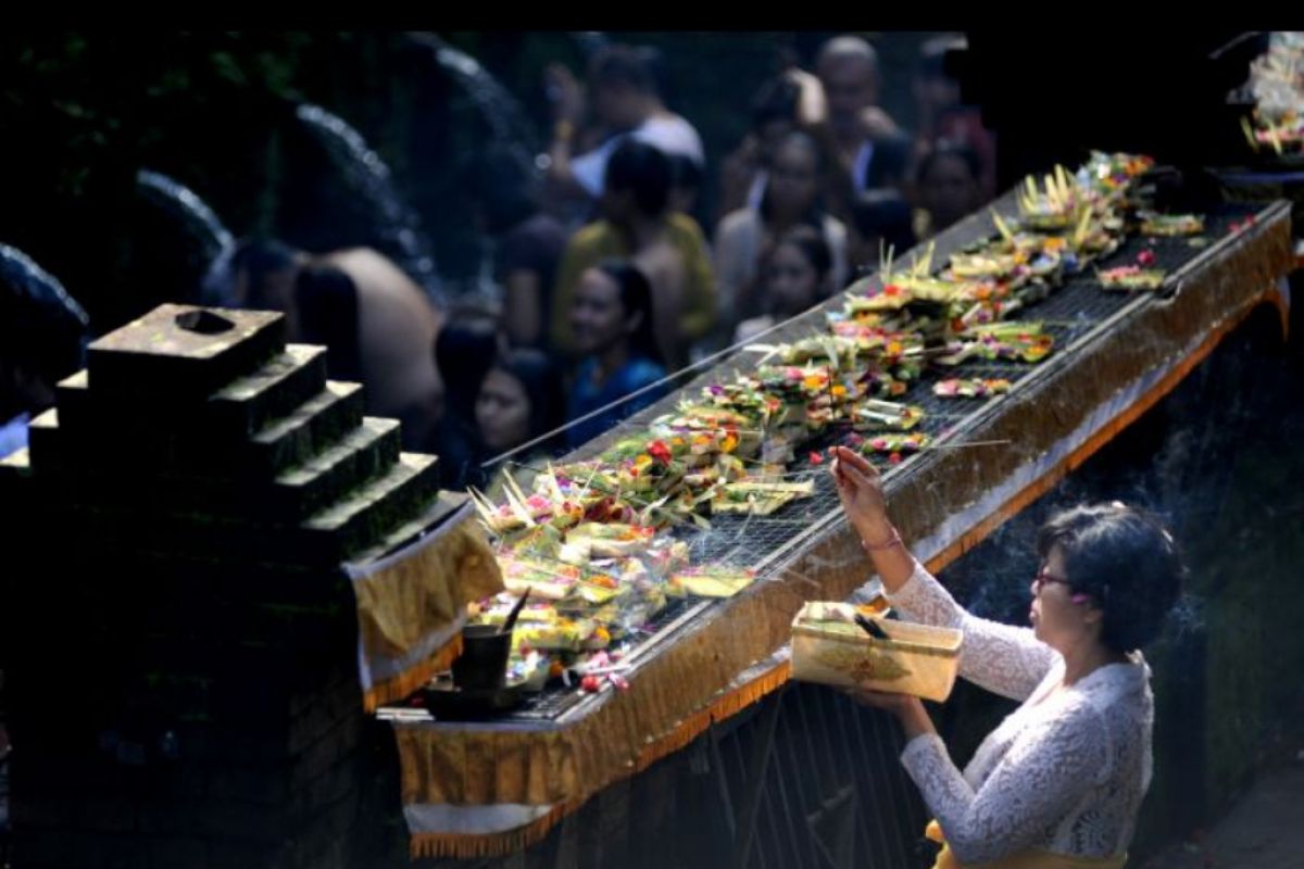 Umat Hindu mempersembahkan sesajen saat Hari Banyu Pinaruh di Pengelukatan Pancoran Solas, Badung, Bali, Minggu (31/1/2021). Hari Banyu Pinaruh merupakan hari yang diyakini oleh umat Hindu sebagai waktu yang baik untuk menyucikan dan membersihkan diri serta pikiran secara spiritual dari hal-hal negatif. ANTARA FOTO/Fikri Yusuf/nym.