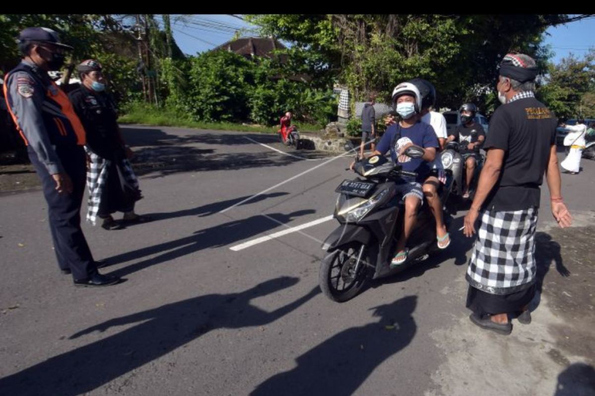 Petugas meminta warga untuk berputar balik arah saat akan berkunjung di Pantai Padang Galak, Denpasar, Bali, Minggu (31/1/2021). Pantai di Denpasar ditutup sementara bagi warga yang akan melakukan ritual pembersihan diri dan aktivitas liburan pada Hari Banyu Pinaruh karena berpotensi menimbulkan kerumunan sekaligus sebagai upaya menekan jumlah kasus COVID-19 yang mengalami peningkatan di wilayah itu. ANTARA FOTO/Nyoman Hendra Wibowo/nym.