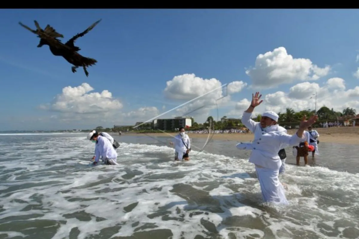 Umat Hindu melakukan ritual mapekelem dalam upacara Melasti menjelang Hari Raya Nyepi Tahun Baru Saka 1943 di Pantai Petitenget, Badung, Bali, Kamis (11/3/2021). Upacara tersebut tetap digelar untuk membersihkan alam secara spiritual, menjaga keseimbangan dan keharmonisan alam serta memohon kepada Tuhan agar pandemi COVID-19 cepat berakhir. ANTARA FOTO/Nyoman Hendra Wibowo/nym.