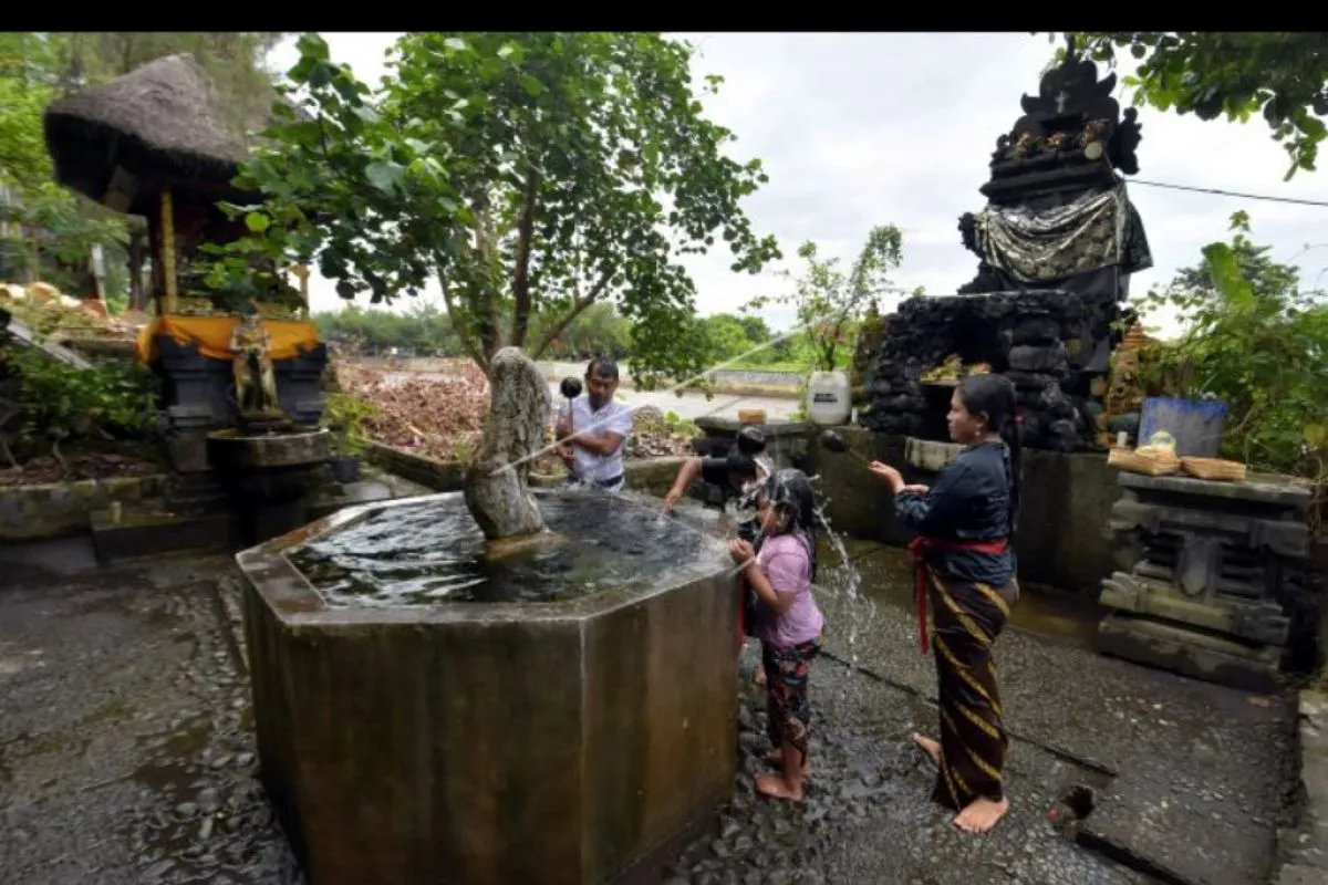 Umat Hindu melakukan ritual melukat atau pembersihan diri pada hari Ngembak Geni yang merupakan rangkaian Hari Raya Nyepi Tahun Saka 1943 di Pura Campuhan Windhu Segara, Denpasar, Bali, Senin (15/3/2021). Ritual melukat yang dilakukan oleh umat Hindu setelah menjalani "catur brata penyepian" tersebut untuk pembersihan pikiran dan jiwa secara spiritual serta memohon keselamatan dan kesehatan. ANTARA FOTO/Nyoman Hendra Wibowo/nym.