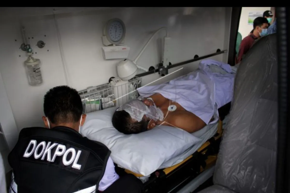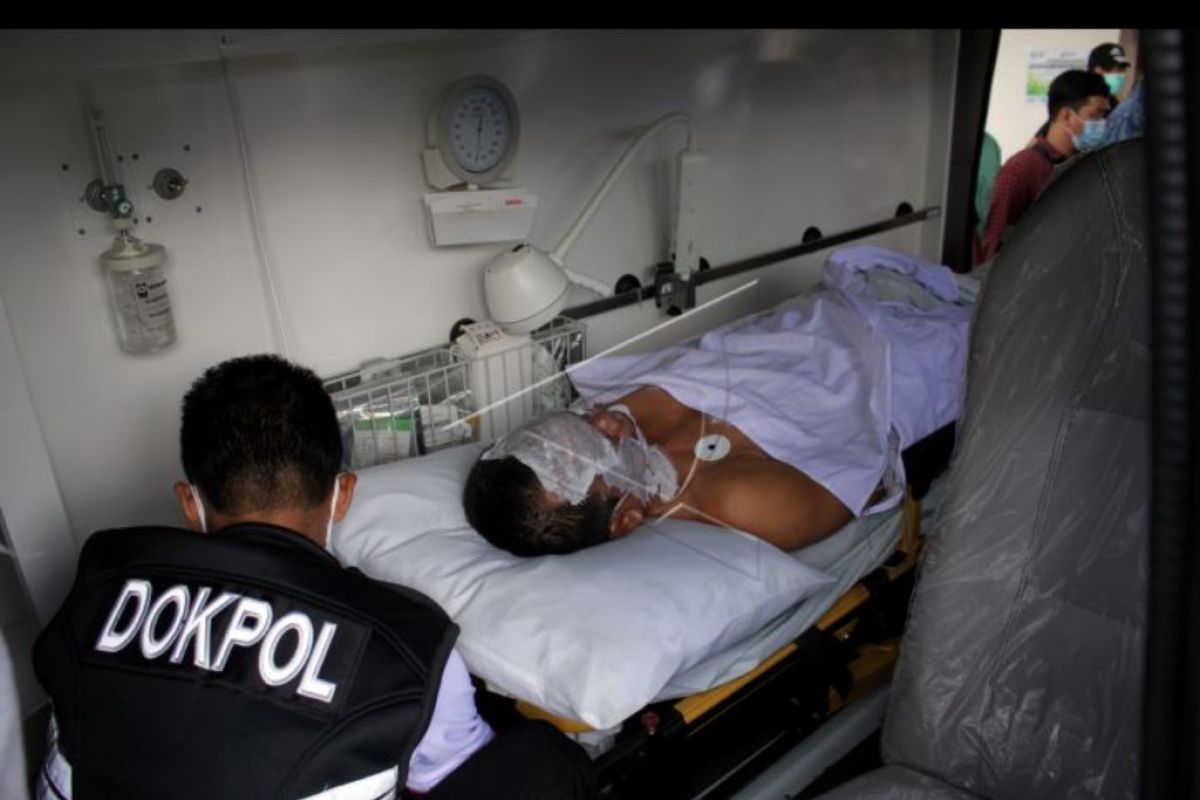 Personel Dokpol Polda Sulawesi Selatan membawa korban ledakan bom ke dalam mobil ambulans untuk dirujuk ke Rumah Sakit Bhayangkara di Makassar, Sulawesi Selatan, Minggu (28/3/2021). Korban luka ringan hingga berat akibat ledakan bom di Gereja Katedral Makassar bertambah menjadi 20 orang dan korban tewas berjumlah dua orang yang diduga pelaku bom bunuh diri. ANTARA FOTO/Arnas Padda/nym