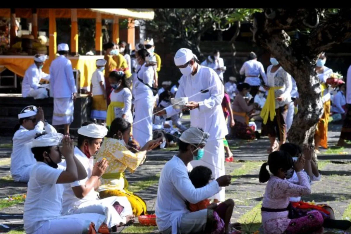 Pemuka agama Hindu memercikkan air suci saat persembahyangan Hari Raya Galungan di Pura Jagatnatha, Denpasar, Bali, Rabu (14/4/2021). Perayaan Hari Raya Galungan yang merupakan hari kemenangan kebenaran (Dharma) atas kejahatan (Adharma) itu diikuti umat Hindu di Bali dengan menerapkan protokol kesehatan untuk mencegah penyebaran pandemi COVID-19. ANTARA FOTO/Fikri Yusuf/nym.