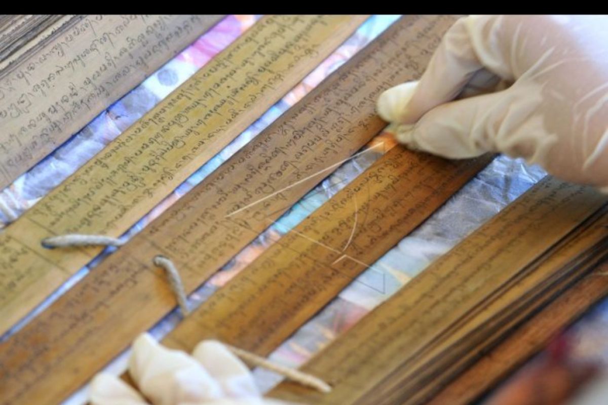 Mahasiswa membersihkan lontar saat kegiatan Katalogisasi dan Identifikasi Pustaka Lontar di kawasan Kesiman Petilan, Denpasar, Bali, Rabu (28/4/2021). Kegiatan itu dilakukan sebagai upaya konservasi dan pelestarian lontar yang merupakan warisan budaya Bali. ANTARA FOTO/Fikri Yusuf/nym.