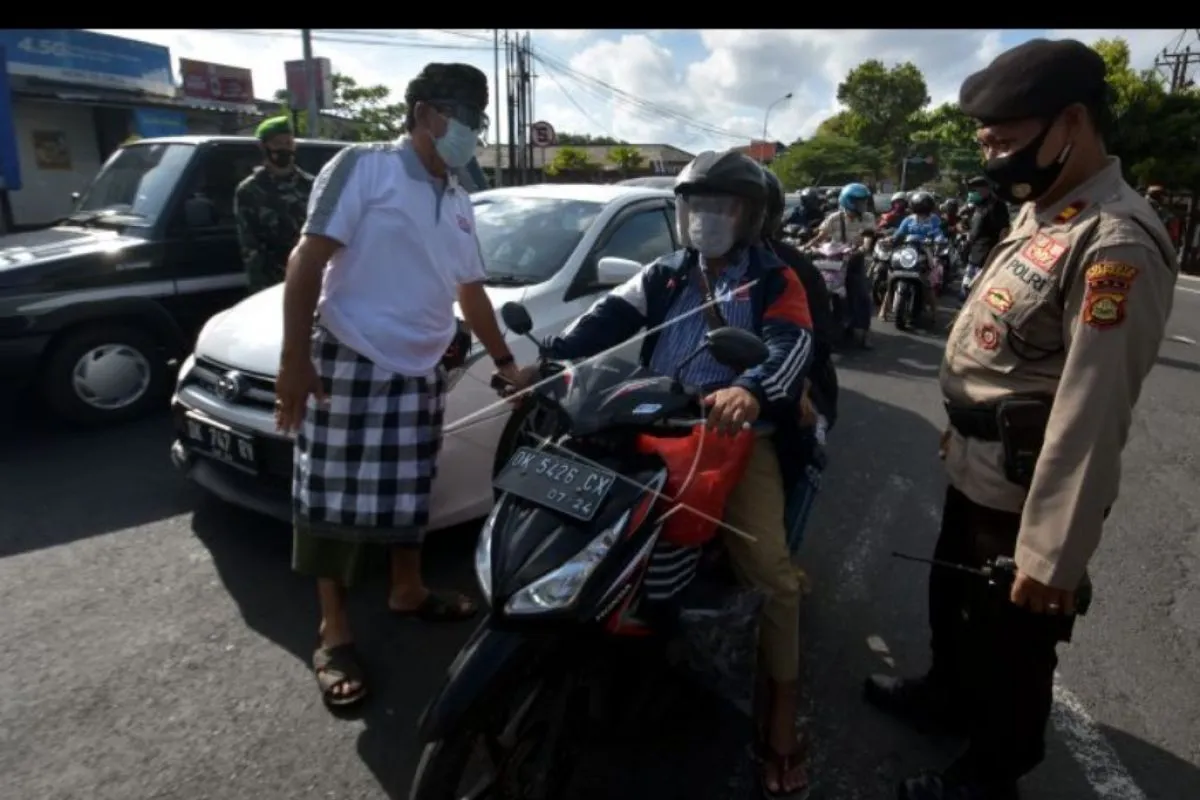 Polisi dibantu pecalang atau petugas keamanan desa adat menghentikan pengendara sepeda motor saat penyekatan larangan mudik di Denpasar, Bali, Kamis (6/5/2021). Kegiatan penyekatan larangan mudik Hari Raya Idul Fitri 1442 Hijriah di Posko Induk Uma Anyar, Denpasar tersebut melibatkan pecalang untuk memperketat pengamanan di jalur itu guna mengantisipasi warga yang nekat pulang kampung. ANTARA FOTO/Nyoman Hendra Wibowo/nym.