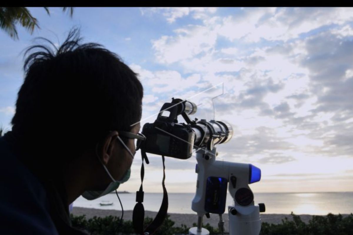Petugas mengamati posisi hilal menggunakan teropong saat pemantauan di Pantai Jerman, Kuta, Bali, Selasa (11/5/2021). Pemantauan Hilal dilakukan di 88 titik yang tersebar di seluruh Indonesia untuk menentukan 1 Syawal 1442 Hijriah. ANTARA FOTO/Fikri Yusuf/nym.