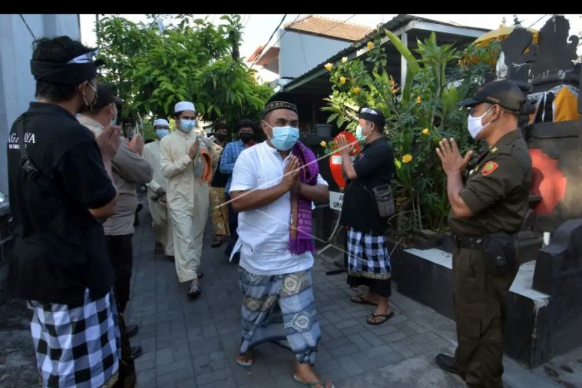 Pecalang dan petugas keamanan lainnya memberi salam kepada umat Islam seusai beribadah Shalat Idulfitri 1442 H di Mushola Silaturrahmi, Denpasar, Bali, Kamis (13/5/2021). Salat Idul Fitri di tempat tersebut melibatkan pecalang untuk menjaga keamanan dan kenyamanan umat Islam saat menjalankan ibadah. ANTARA FOTO/Nyoman Hendra Wibowo/nym.