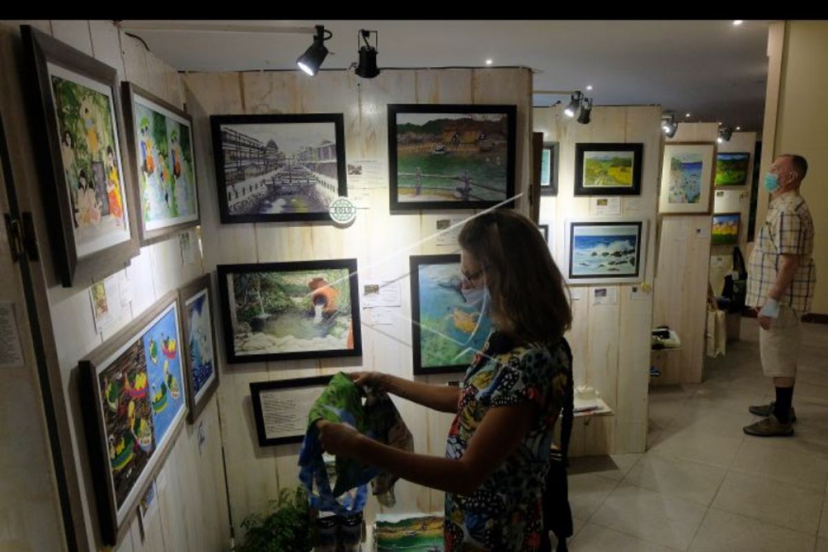 Warga negara asing mengunjungi pameran lukisan dan produk ramah lingkungan bertema "Peduli Alam" di Sanur, Denpasar, Bali, Minggu (6/6/2021). Kegiatan yang digelar pada 6 Juni - 10 Juli 2021 dari kelompok Sanur Painter tersebut menampilkan karya dari para perempuan berusia 40-70 tahun untuk dapat mengubah cara pandang dan menginsipirasi masyarakat untuk lebih peduli terhadap alam. ANTARA FOTO/Nyoman Hendra Wibowo/nym