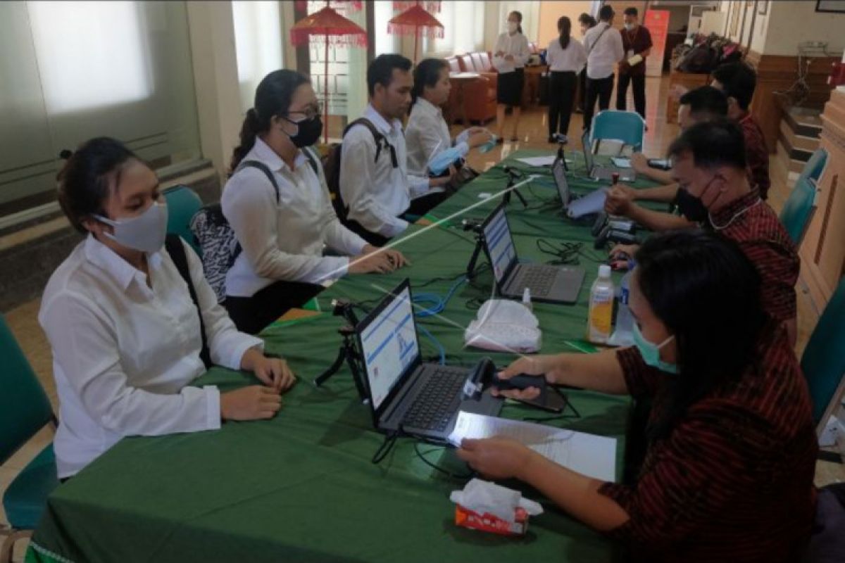 Petugas memeriksa identitas peserta saat akan memasuki ruangan ujian Seleksi Kompetensi Dasar (SKD) Calon Pegawai Negeri Sipil (CPNS) di lingkungan Provinsi Bali tahun 2021 di Kantor Badan Pengembangan Sumber Daya Manusia (BPSDM) Provinsi Bali, Denpasar, Bali, Selasa (7/9/2021). Formasi CPNS untuk Bali pada seleksi tahun 2021 total mencapai 1.035 yang diperebutkan oleh 24.403 pelamar. ANTARA FOTO/Nyoman Hendra Wibowo/nym.