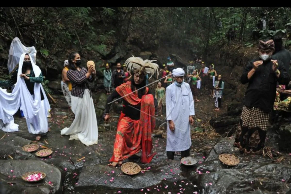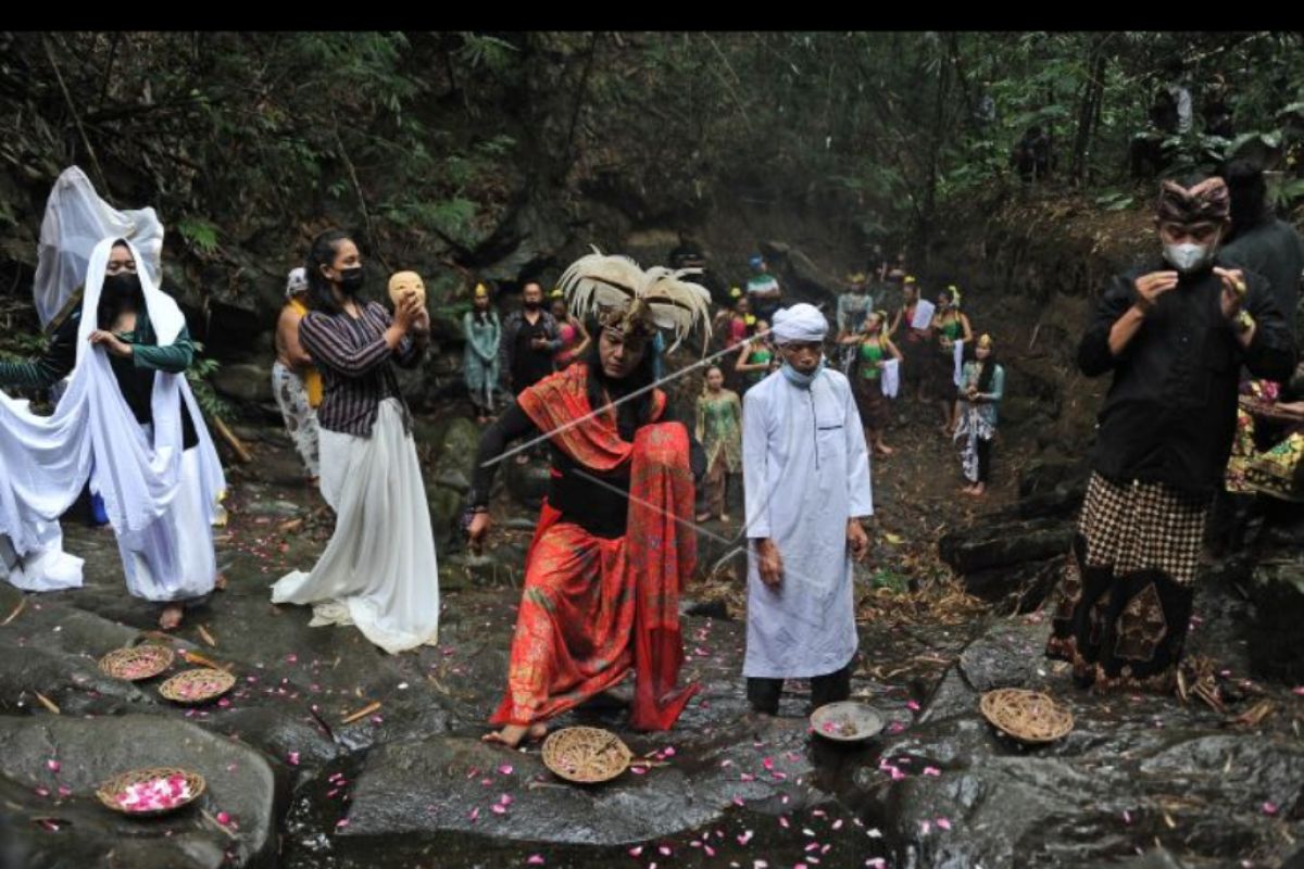 Sejumlah seniman menampilkan pertunjukan seni tari Peradaban Desa saat Festival Lima Gunung (FLG) XX di kawasan lereng Gunung Merbabu, Warangan, Pakis, Magelang, Jateng, Minggu (12/9/2021). FLG tahun ini mengusung tema Peradaban Desa yang diselenggarakan secara daring dengan peserta terbatas guna mencegah penyebaran COVID-19. ANTARA FOTO/Anis Efizudin/nym.