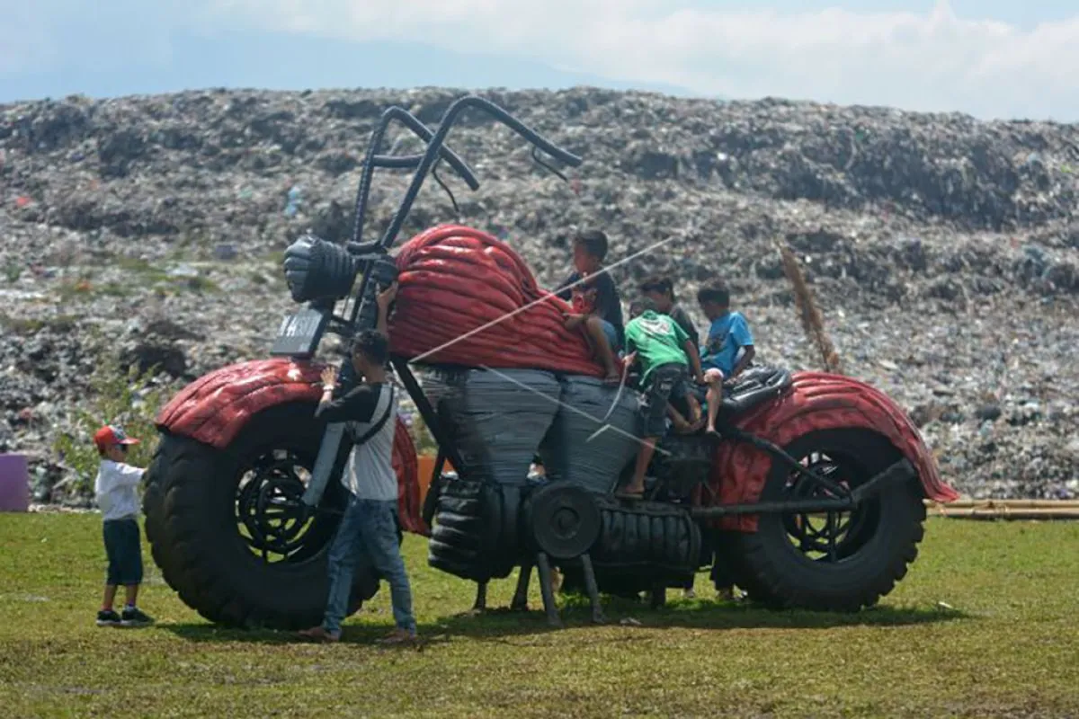 Sejumlah anak bermain di replika motor besar yang terbuat dari bahan bekas di tempat pembuangan akhir (TPA) sampah Pakusari, Jember, Jawa Timur, Sabtu (18/9/2021). Pemerintah Kabupaten Jember bersama aktivis lingkungan berkampanye memilih dan memilah sampah sebelum dibuang ke TPA sampah bertepatan dengan peringatan Hari World Cleanup Day 2021 pada 18 September, dengan mengolahnya menjadi replika motor besar, dinosaurus, dan rumah botol. ANTARA FOTO/Seno/nym.